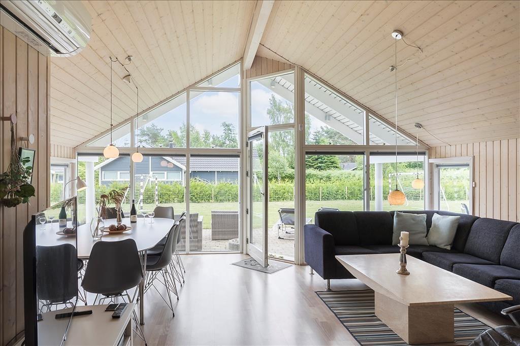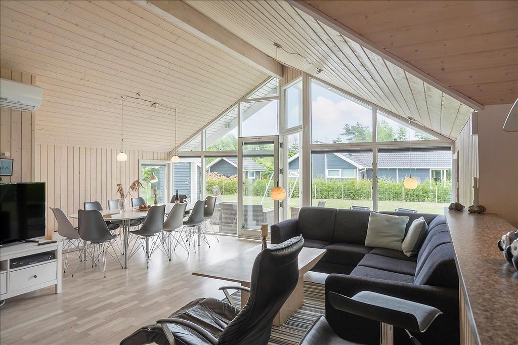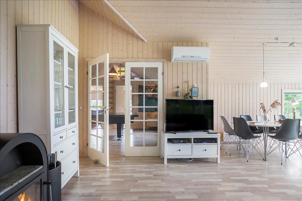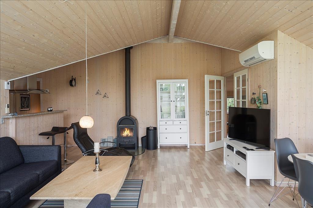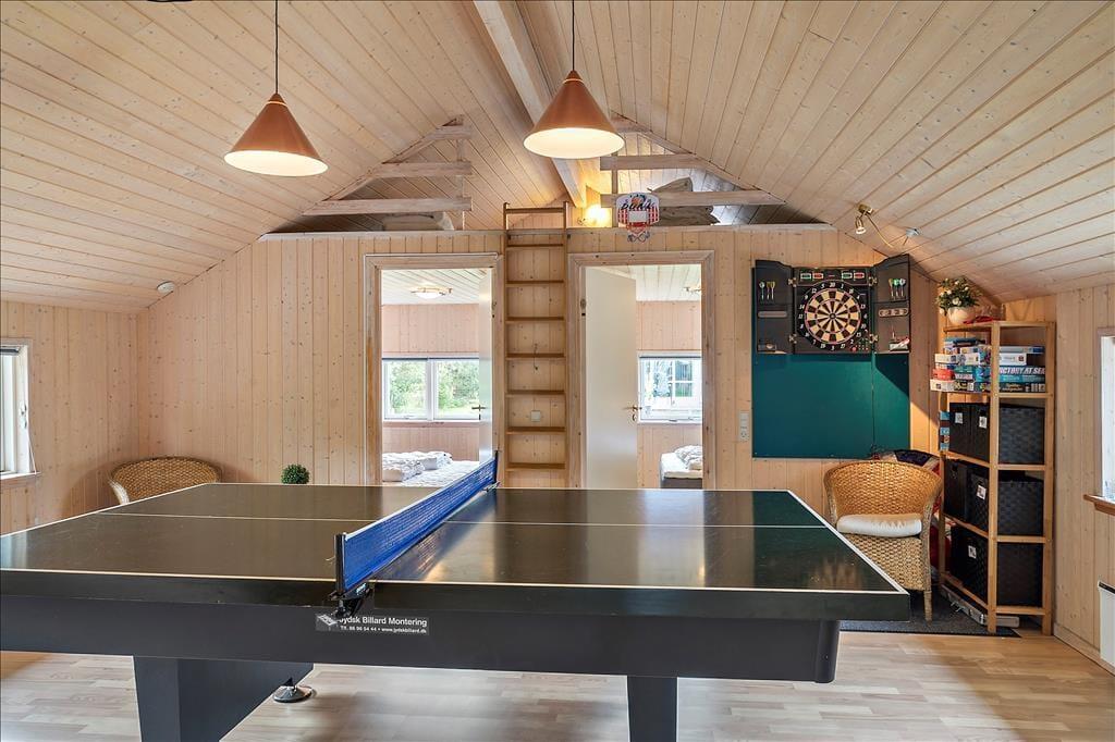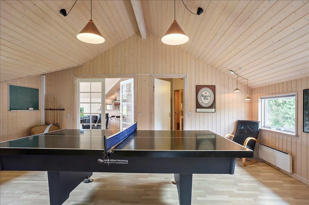 Fritidshuset indeholder: 4 gode soveværelser og 1 hems med 4 madrasser, et stort badeværelse med spa, sauna, wc og bruser, samt et badeværelse med WC, bruser, vaskemaskine og tørretumbler, køkken-alrum med spiseområde sofaafdeling, derudover indeholder fritidshuset også et stort aktivitetsrum med bordtennis, billard-bord og dart. Samt udgang fra stuen til en skøn terrasse.