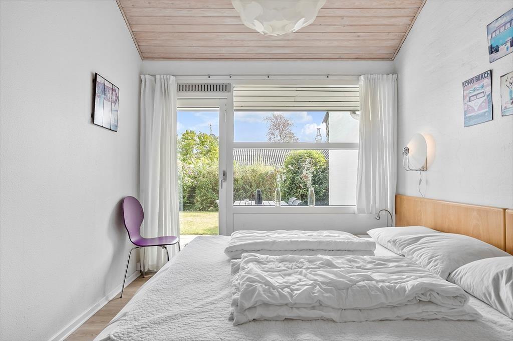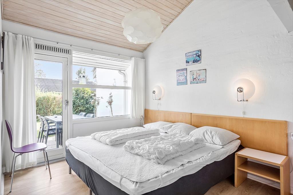 Soveværelse med dobbeltseng, spejl, skabsplads og udgang til terrasse.