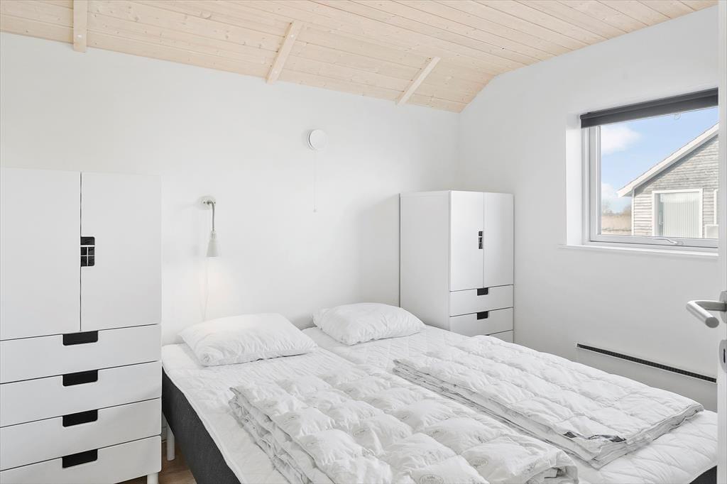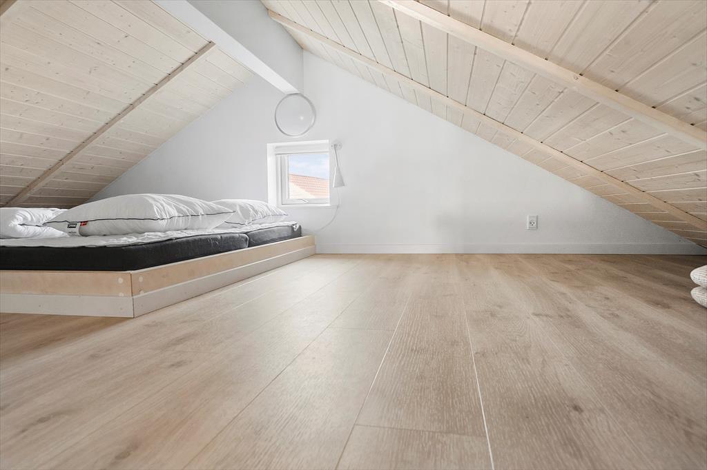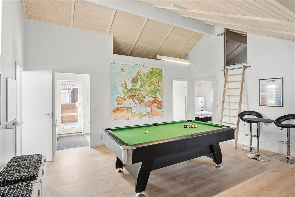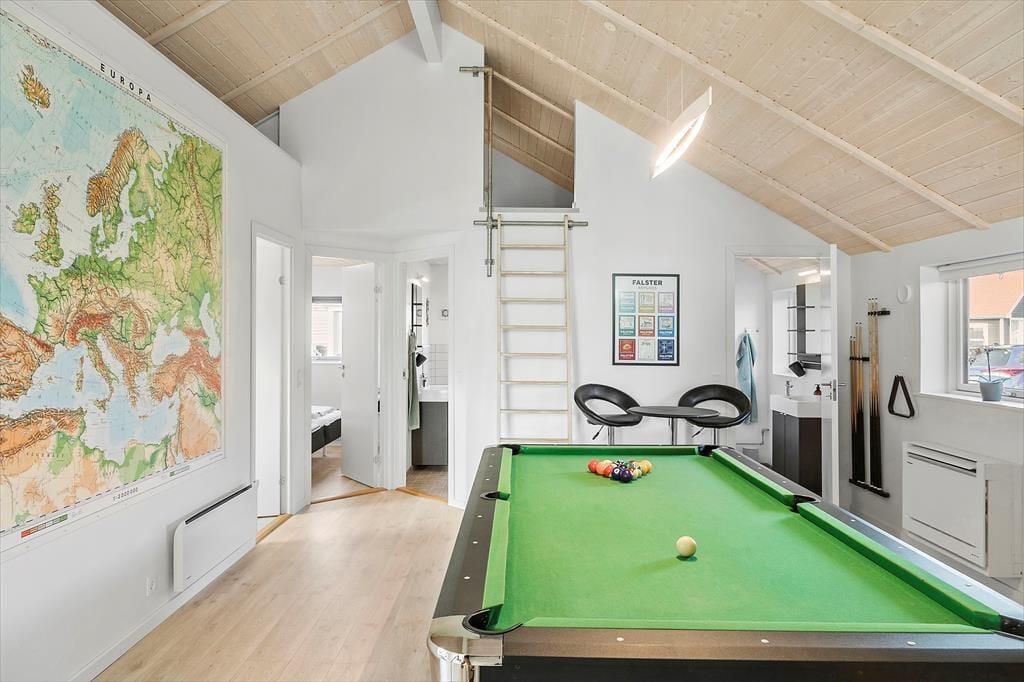 Feriehuset byder på 2 gode soveværelser, en alkove og en hems med 2 madrasser. 2 badeværelser hvor det ene indeholder bruser, WC, badekar, og sauna, samt et gæstetoilet. Derudover husets hjerte, som er det skønne køkken-alrum, som indeholder et åbent køkken, en spiseafdeling nær køkkenet, samt en stue og sofaafdeling i den anden ende. Fra stuen er der ligeledes udgang til terrassen, hvorfra der er udsigt til grønne fællesarealer. Desuden indeholder huset også et aktivitetsrum med billardbord og dart.