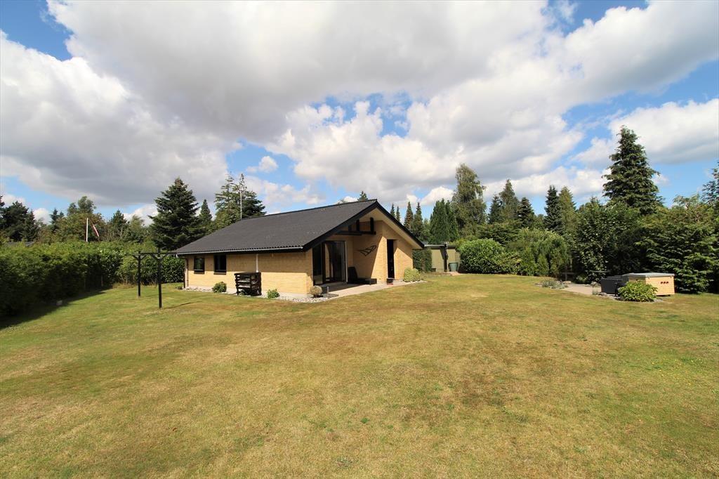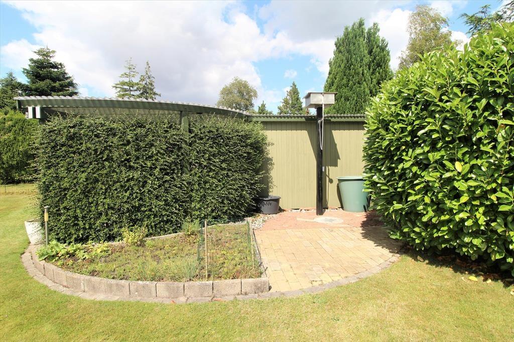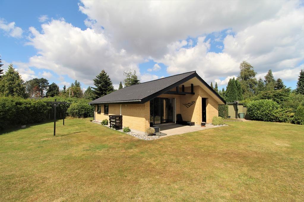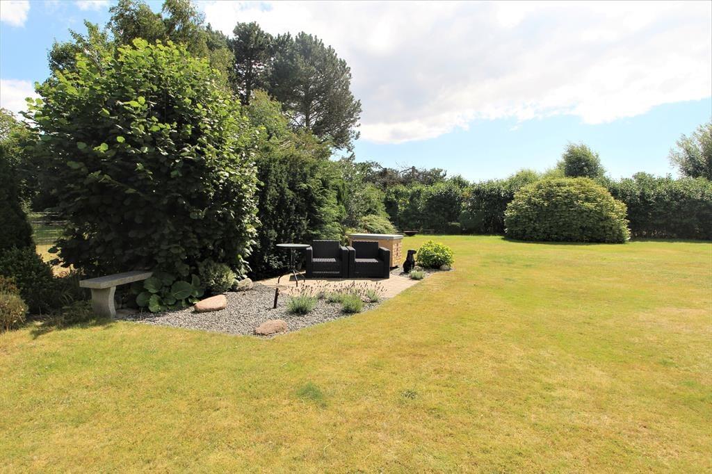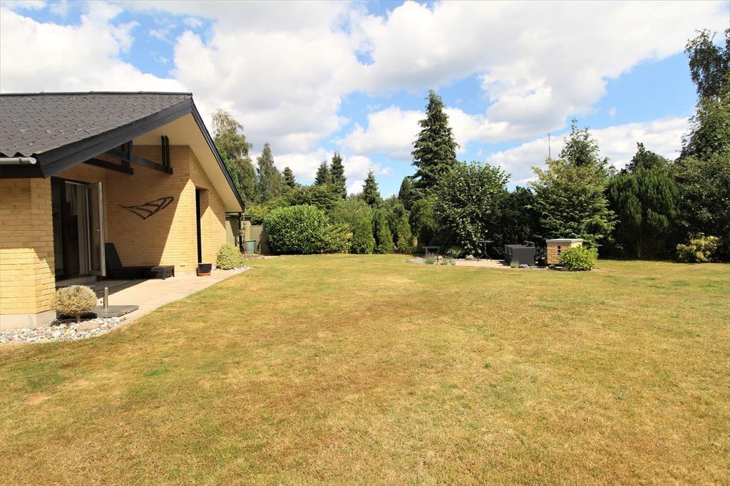 Fra stuen træder I ud på den gode overdækkede terrasse. Her er havemøbler, grill og direkte udgang til den store græsplæne med godt med plads på den store grund til at børnene kan spille bold, lege gemmeleg eller at hele familien kan tage et spil kongespil.