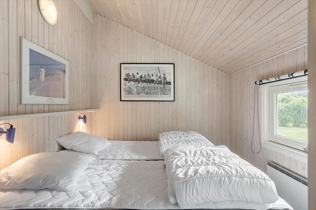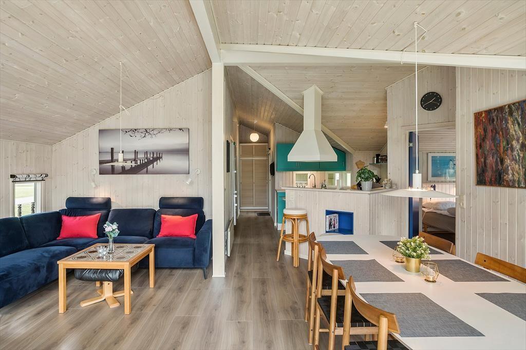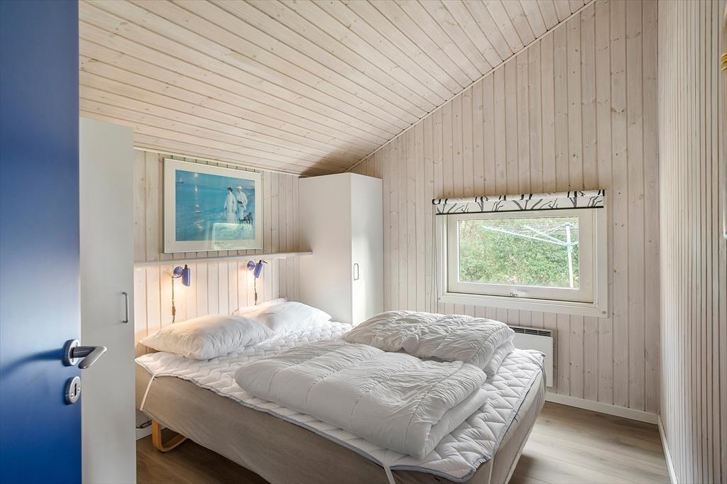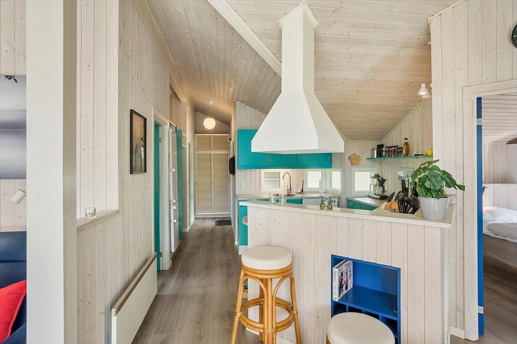 Huset indeholder entre, hvorfra der er indgang til husets badeværelse med wc, bruser og sauna. Derudover er der 3 gode soverum, med dobbeltseng i 2 af værelserne, og køjeseng i det 3 værelse. Huset indeholder et stort og lyst køkken-alrum hvor der er spise-, og sofaafdeling. I stuen er en hyggelig alkove med soveplads til 2 personer. Fra stuen er der udgang til den ene af husets skønne terrasser og husets skønne have.