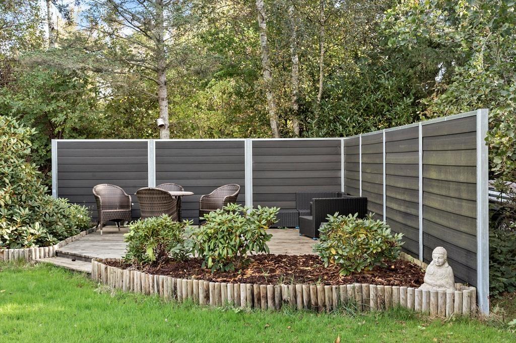 Udenfor tilbyder ejendommen en god carport til bilen og cyklerne, en god delvist overdækket træterrasse og en dejlig have med græsplæne og hyggekrog til eftermiddag- og aften solen.