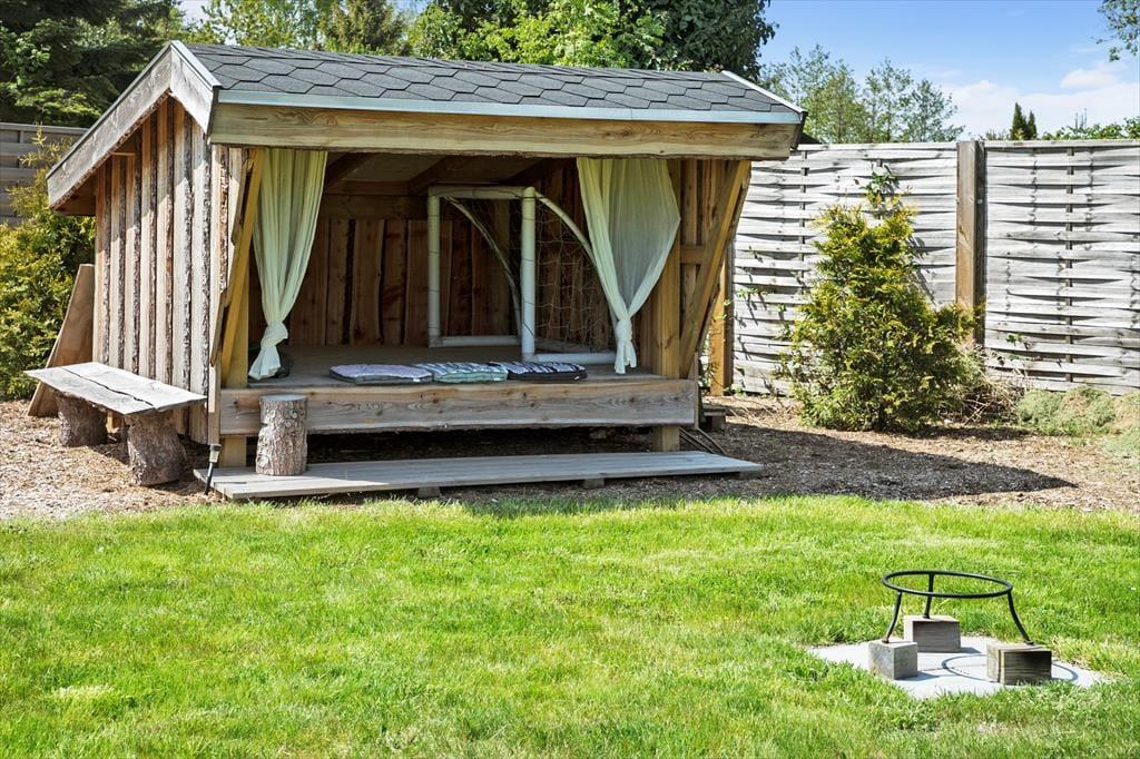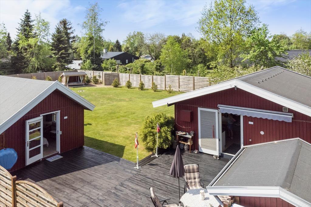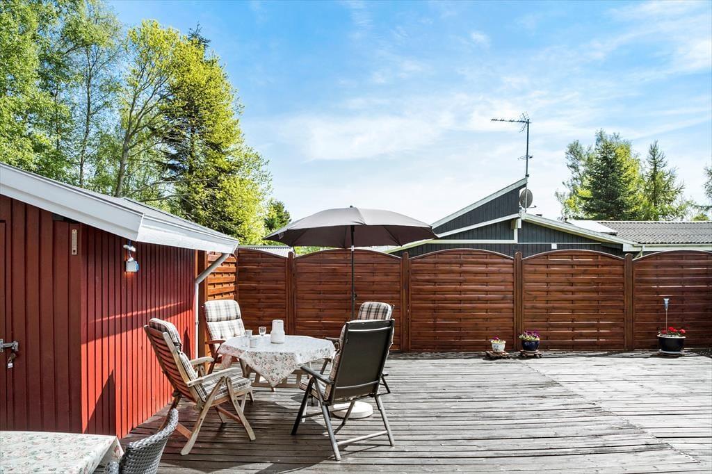Feriehuset er beliggende på en 1000 kvm stor grund, med masser af plads til sjov og leg. Til feriehuset er der en skøn terrasse, samt shelter i haven, hvor der er plads til hygge og samvær.