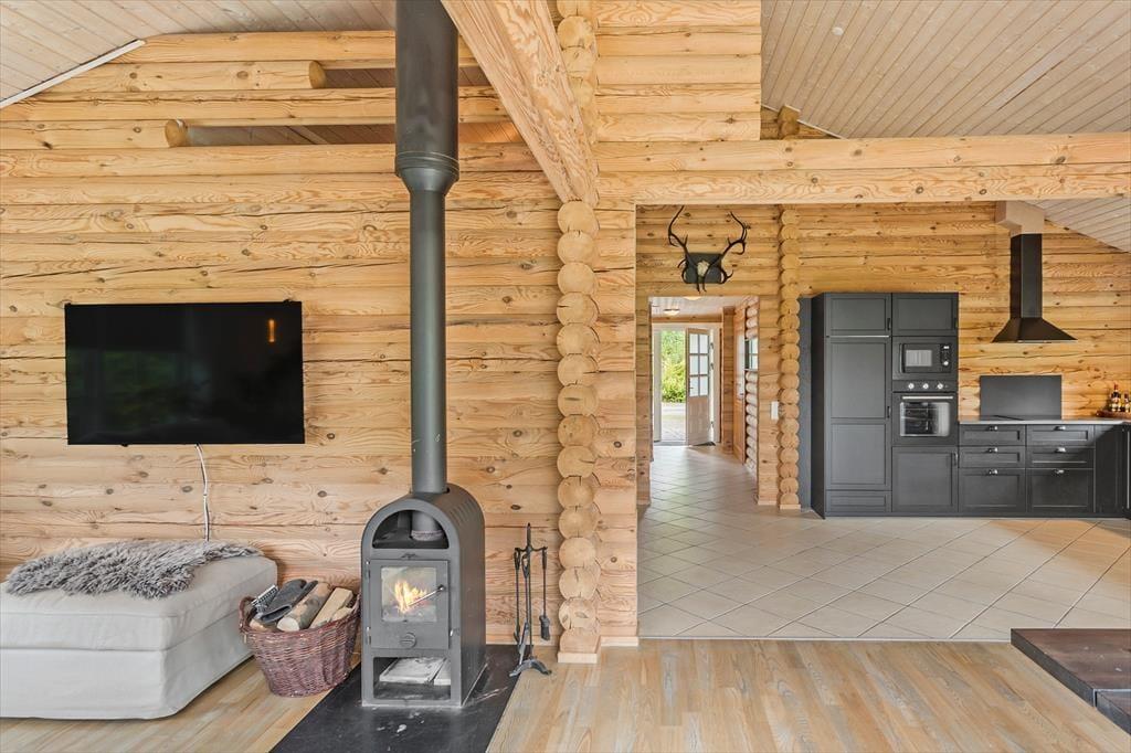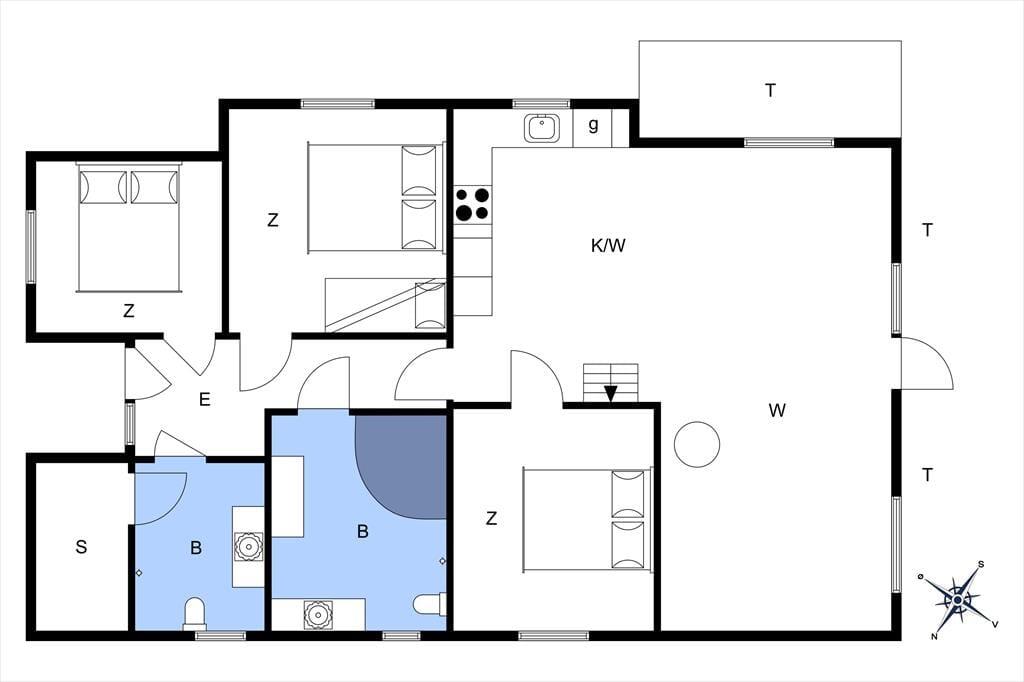 Feriehuset byder på 3 gode soveværelser og en hems med 2 madrasser. I de to af soveværelserne er der dobbeltsenge, og i det sidste soveværelse er der en dobbeltseng og en køjeseng. Derudover har feriehuset to badeværelser, hvor der i det ene er bruser, WC, vaskemaskine, tørretumbler, spabad og sauna. I det andet badeværelse er der wc og bruser. Derudover husets hjerte, som er det skønne køkken-alrum, som indeholder et åbent køkken, en spiseafdeling nær køkkenet, samt en stue og sofaafdeling i den anden ende. Fra stuen er der ligeledes udgang til terrassen, hvorfra der er udsigt til grønne fællesarealer.