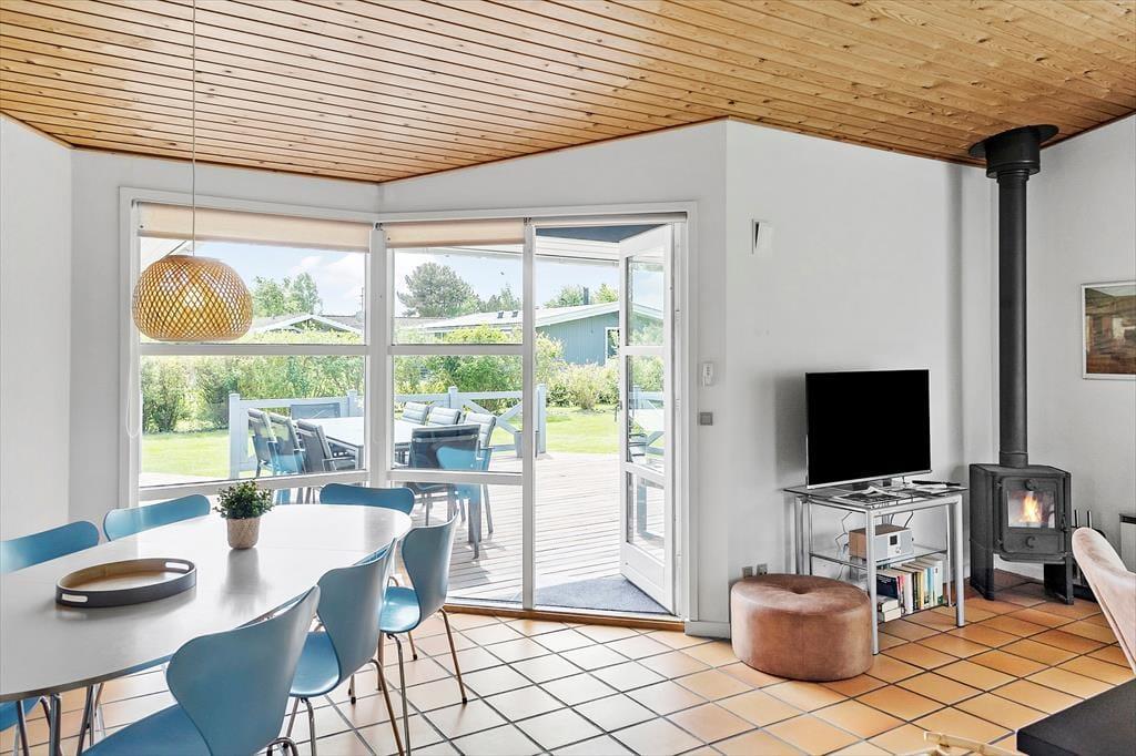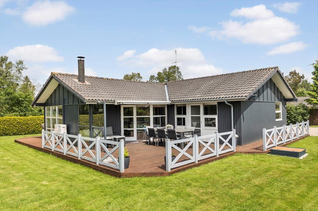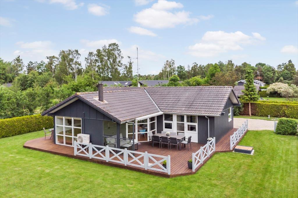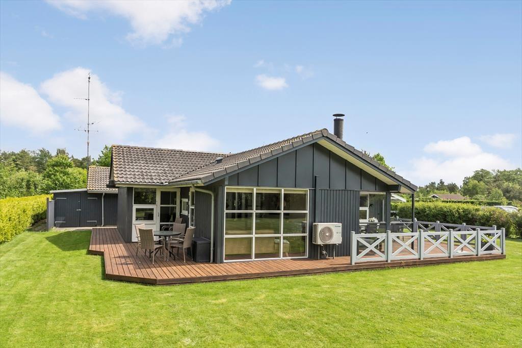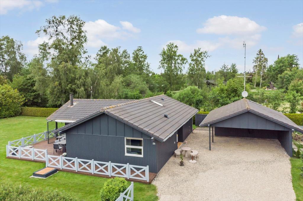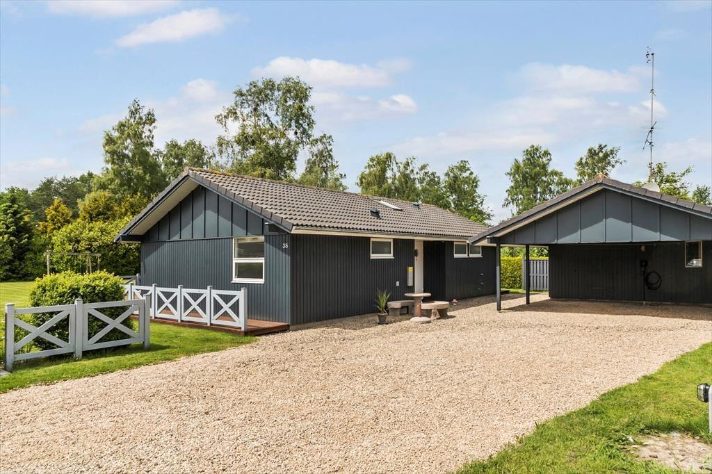 Feriehuset er beliggende på en 1.194 m2 stor grund, hvor der er plads til en masse udendørs aktiviteter. Til feriehuset er en skøn terrasse med havemøbler og grill, derudover er der en carport i indkørslen. I haven er der gyngestativ og sandkasse til de små.