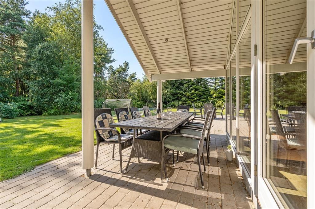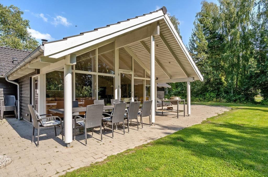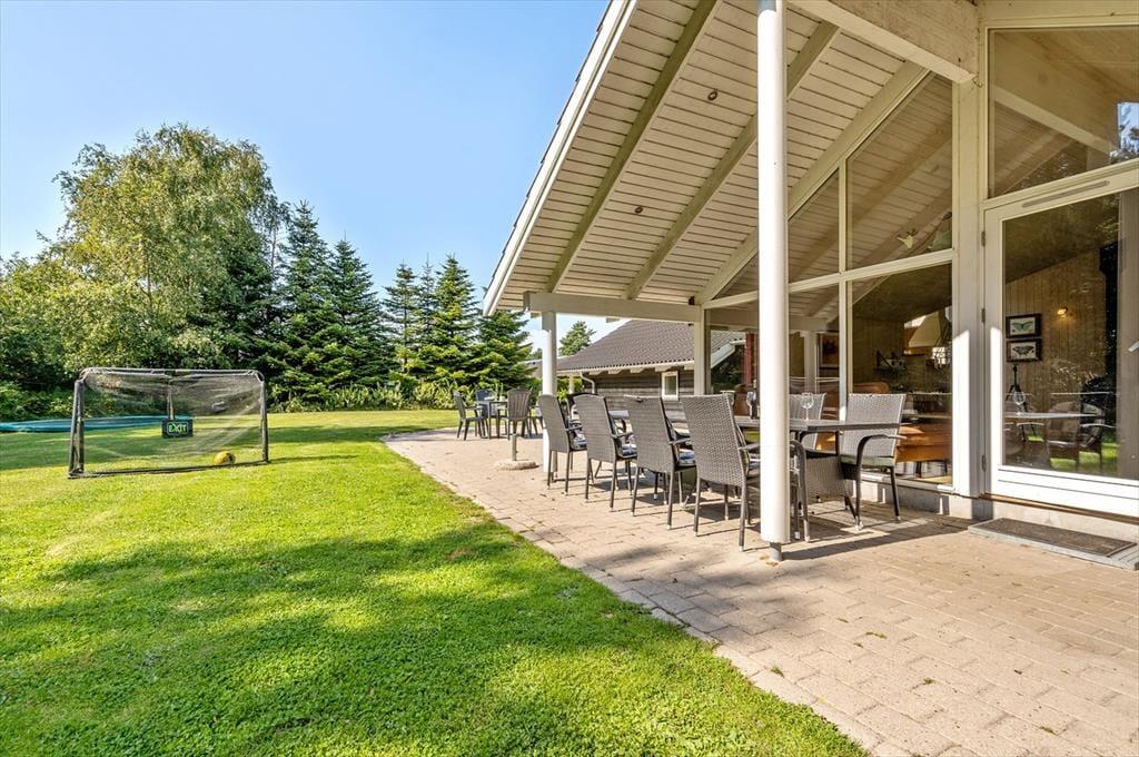 Ferieboligen er beliggende på en stor grund. Til ferieboligen hører 60 m² terrasseareal hvoraf 14 m² er overdækket terrasse. Gynge. Sandkasse. Trampolin. Fodboldmål. og parkering lige ved ferieboligen.