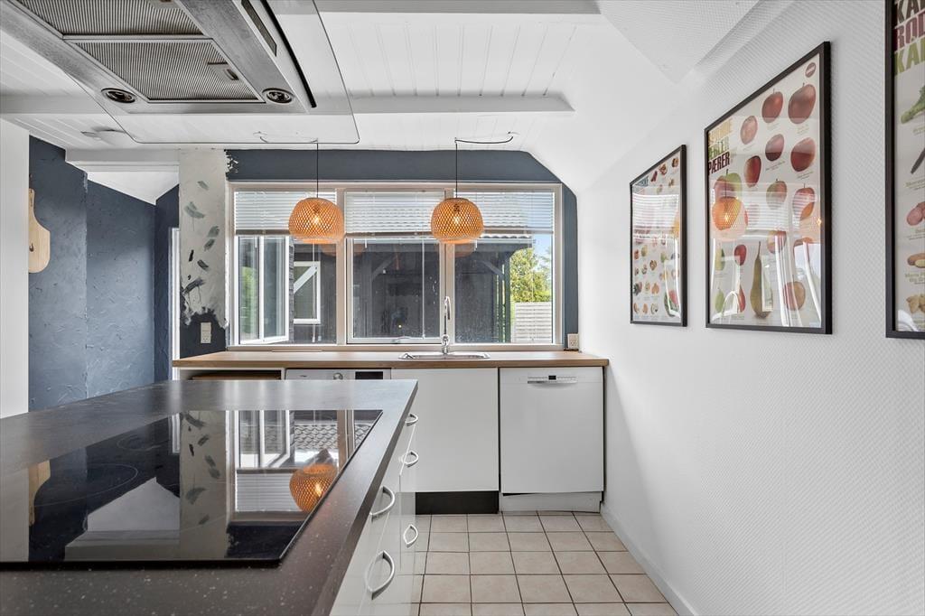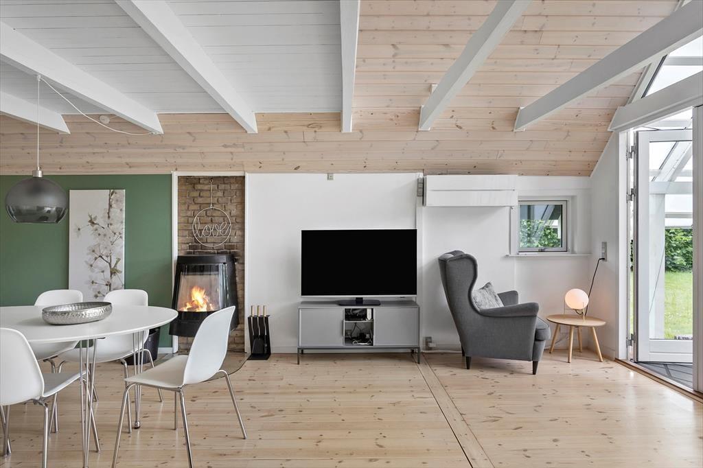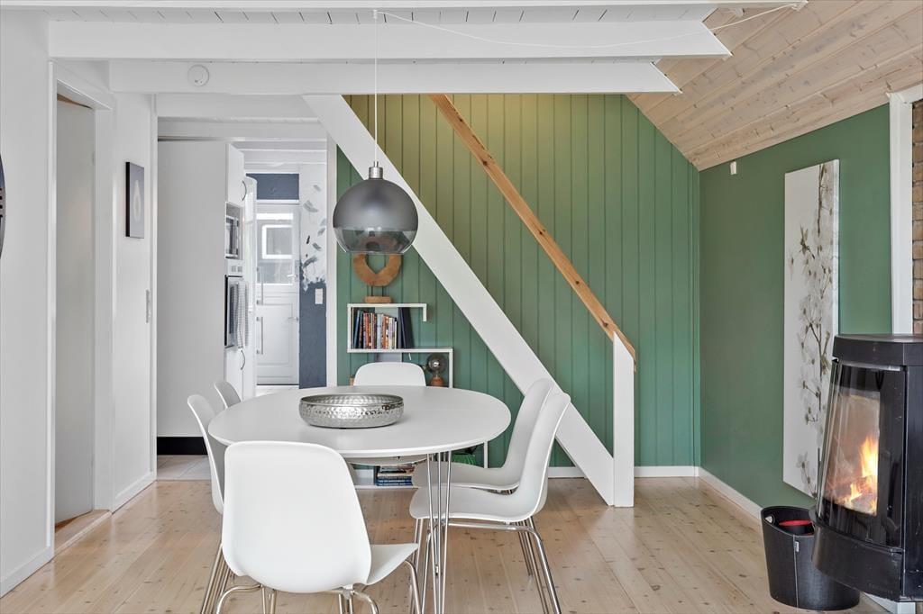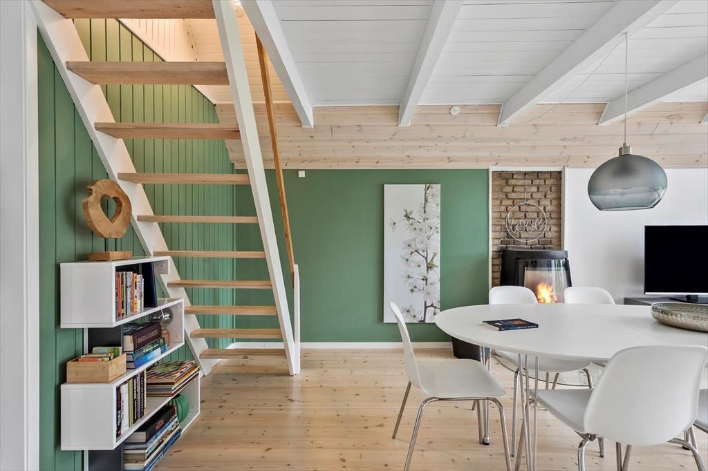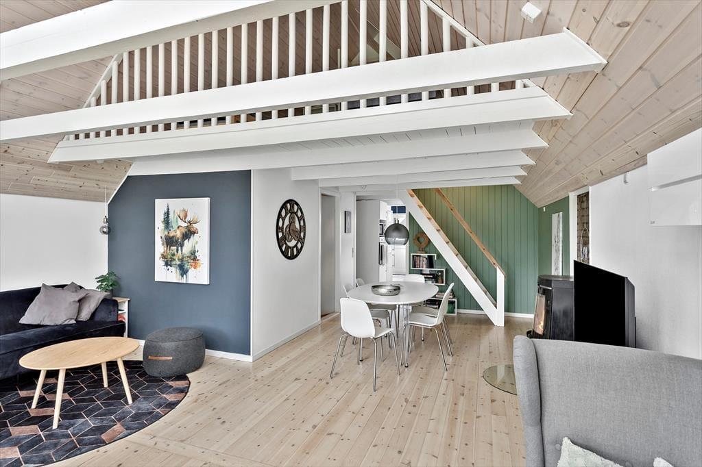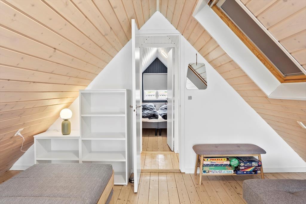 Dette feriehus indeholder 2 gode soveværelser med dobbeltseng i begge, derudover er der en hems med 2 enkeltmandssenge. Det ene soveværelse ligger i stueetagen, hvor de andre sovepladser ligger på feriehusets 1 sal. Derudover har feriehuset et køkken, men udgang til spisestue og stue. I stuen er der et dejligt stort vinduesparti, hvor der er udgang til feriehusets skønne terrasse og have.