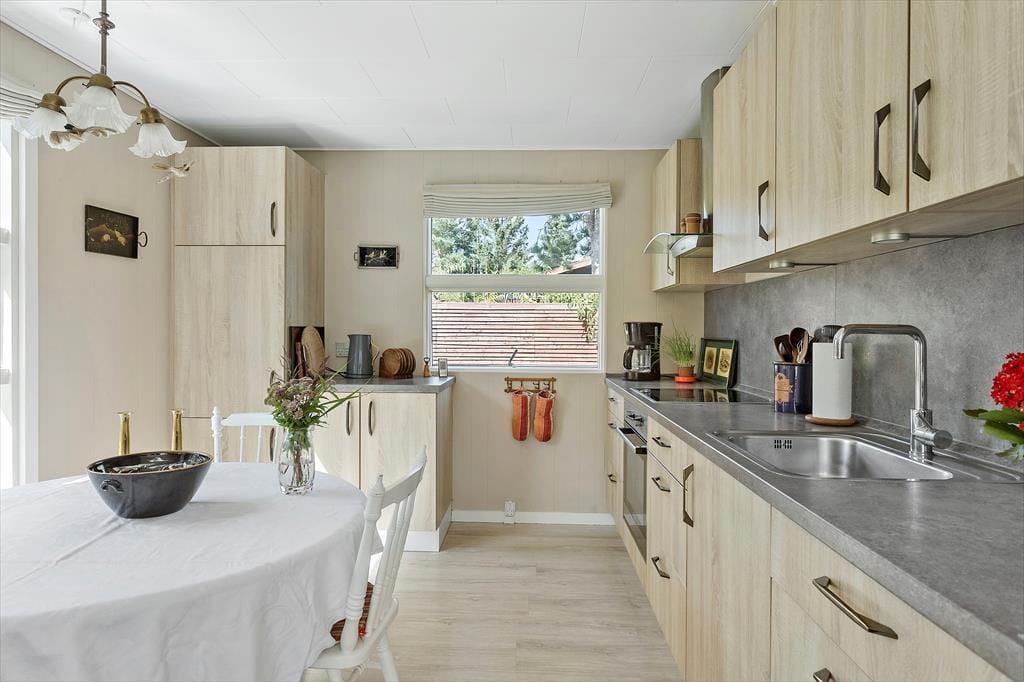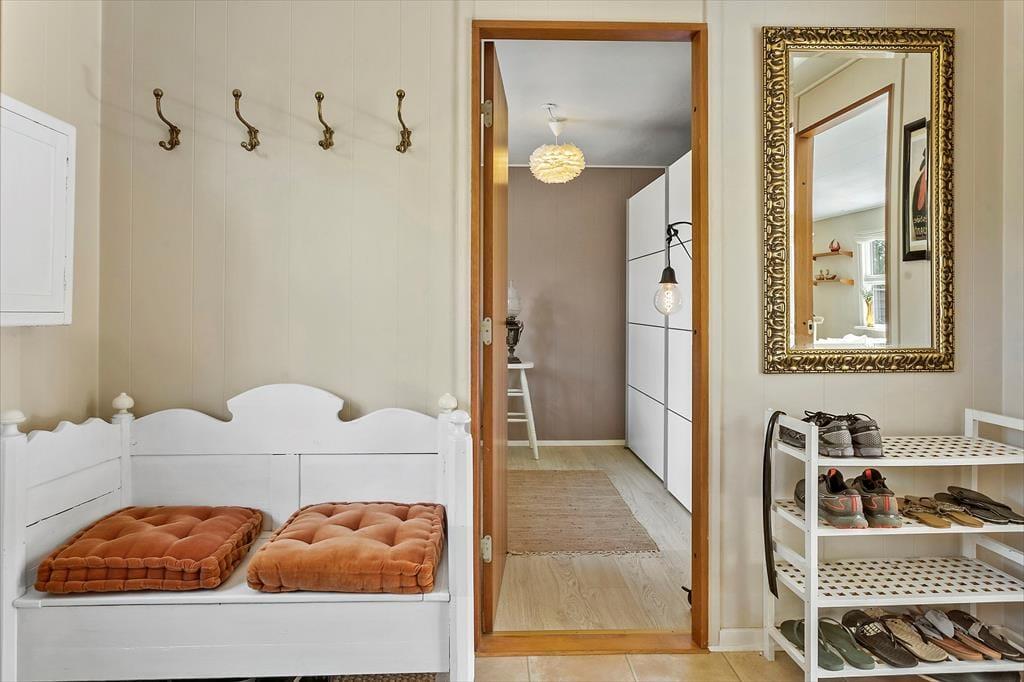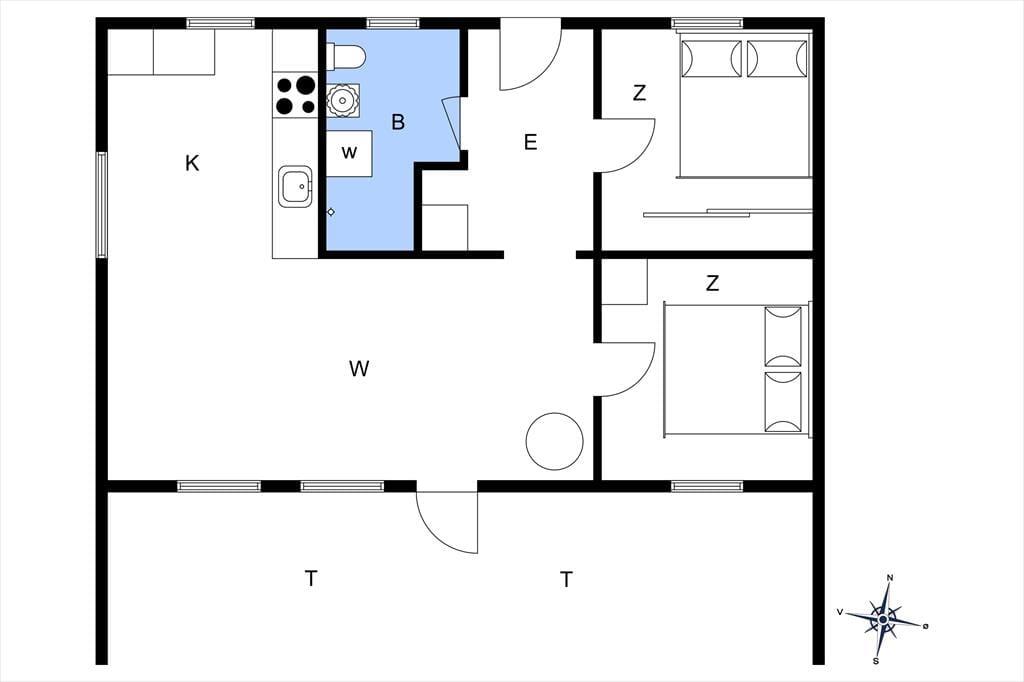 Dette hyggelige feriehus indeholder: en entre, to gode soveværelser med dobbeltsenge i begge. Et badeværelse med wc, bruser og vaskemaskine. Derudover har feriehuset et køkken, med udgang til spisestue og stuen. Fra stuen er der udgang til feriehusets skønne terrasse.