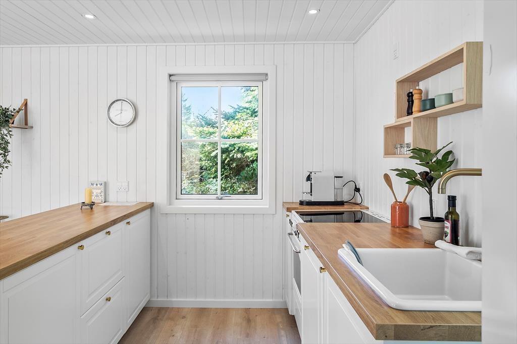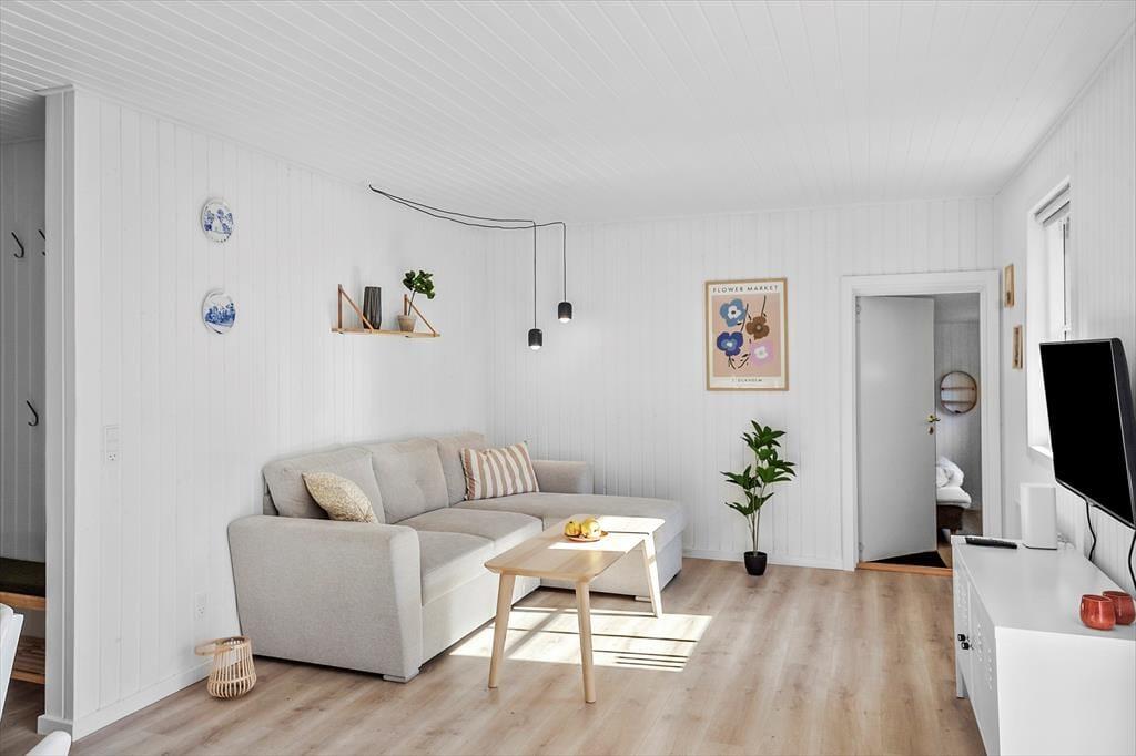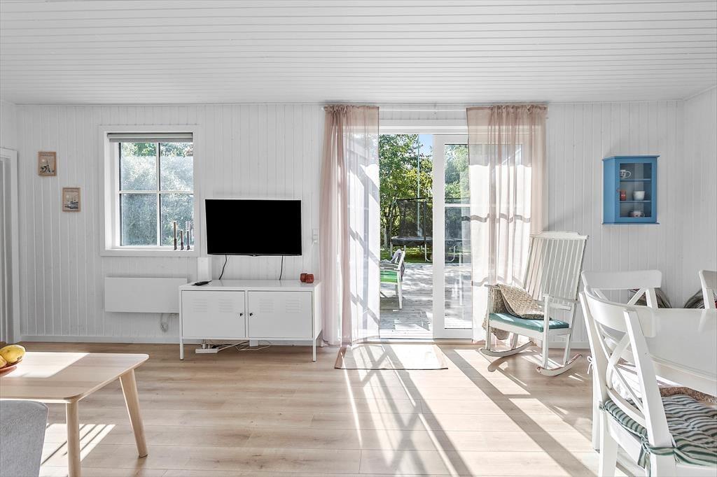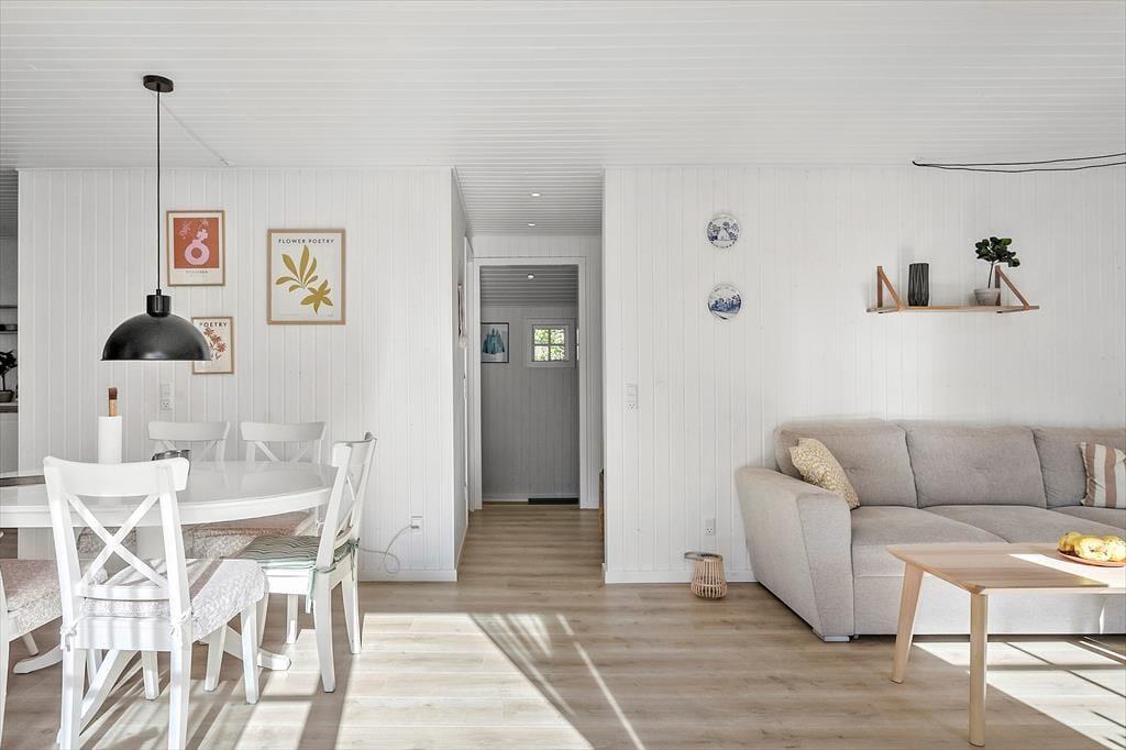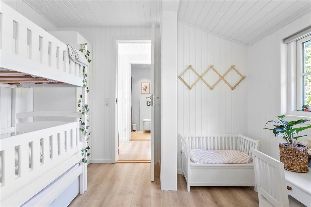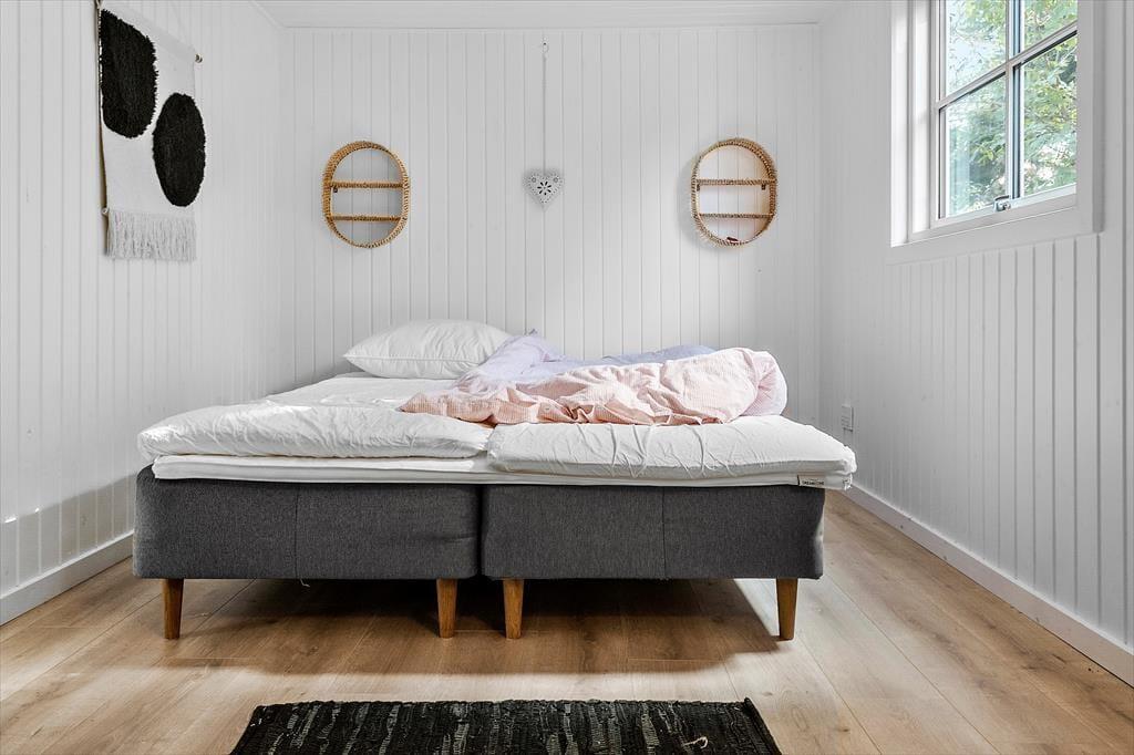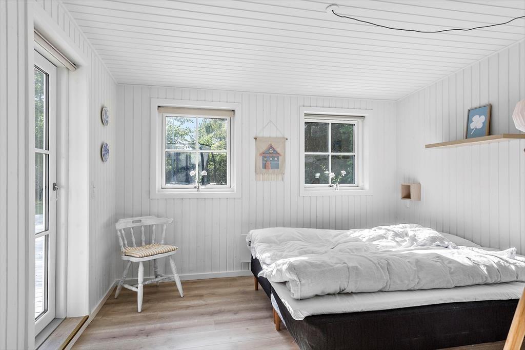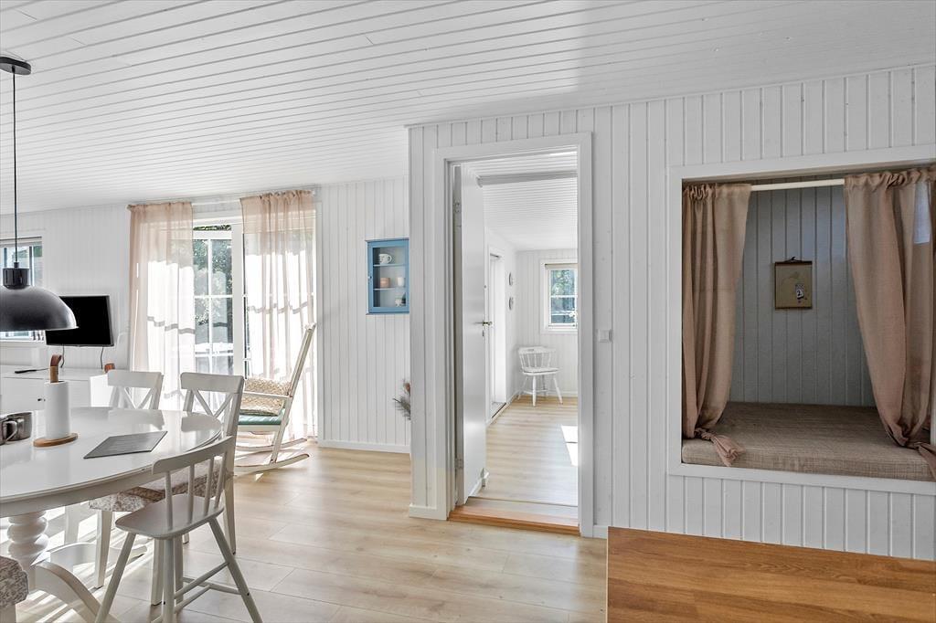 Feriehuset byder på en entre, 1 badeværelse med wc og bruser. Derudover er der 3 soveværelser, hvor der er dobbeltseng i 2 af værelserne + enkeltmandsseng. I det sidste soveværelse er der en enkeltmandsseng. Dernæst har feriehuset et skønt køkken med udgang til spisestue og stuen. Fra stuen er der udgang til husets skønne terrasse.