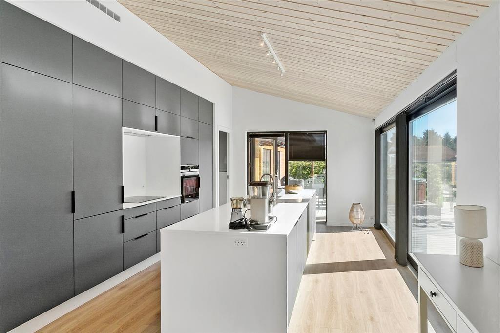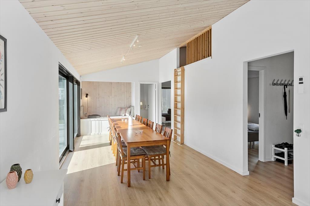 Feriehuset byder på en entre i hoved huset, hvor der er 3 soveværelser. Der er dobbeltseng i 2 af værelserne og 1 enkeltmandsseng i det sidste soveværelse. Der er 1 badeværelse med wc og bruser. Derudover er der det store skønne køkken-alrum, med det skønneste lysindfald. Herfra er der udgang til husets skønne terrasse. I køkken-alrummet er der spiseområde og indgang til feriehusets hyggelige stue.