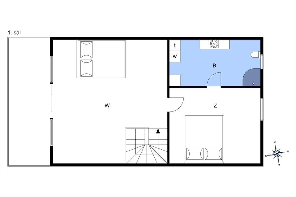 På 1 salen finder man et soveværelse med en dobbeltseng og god skabsplads, et badeværelse med bruseniche, håndvask og WC. Derudover en dejlig stor stue med sofaafdeling. Fra stuen er der også udgang til en skøn altan.