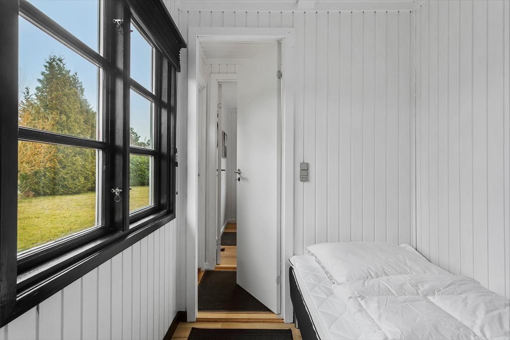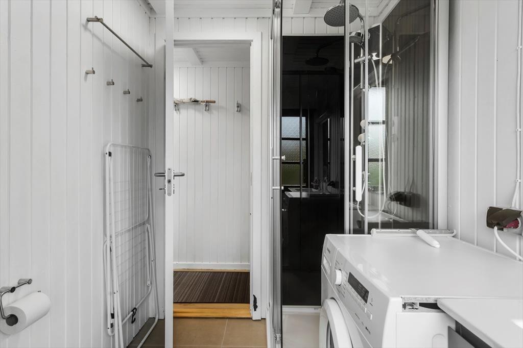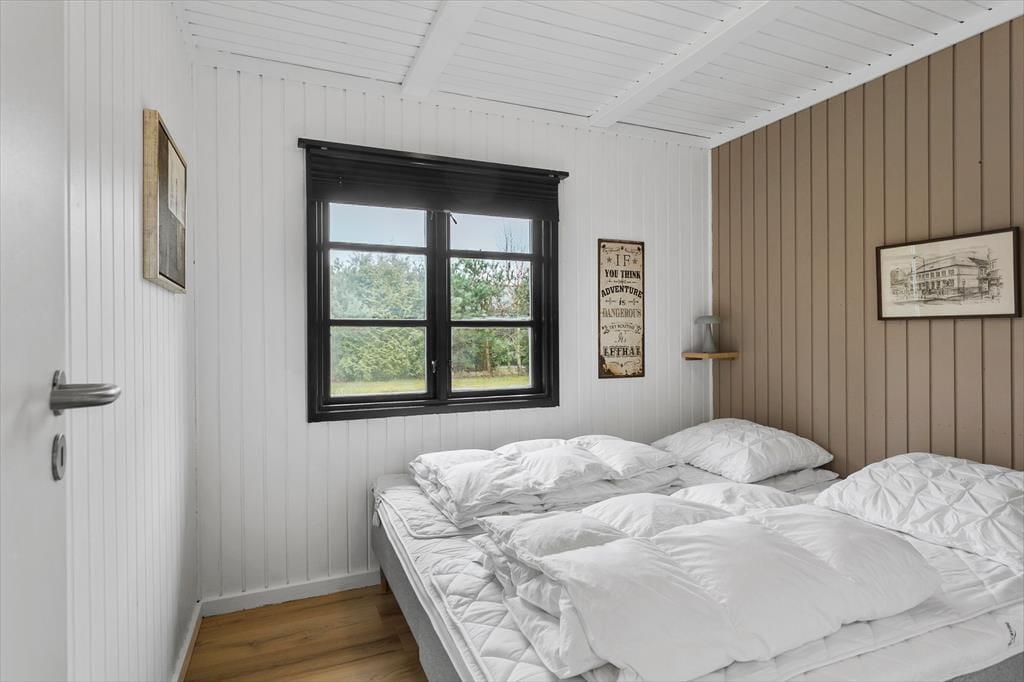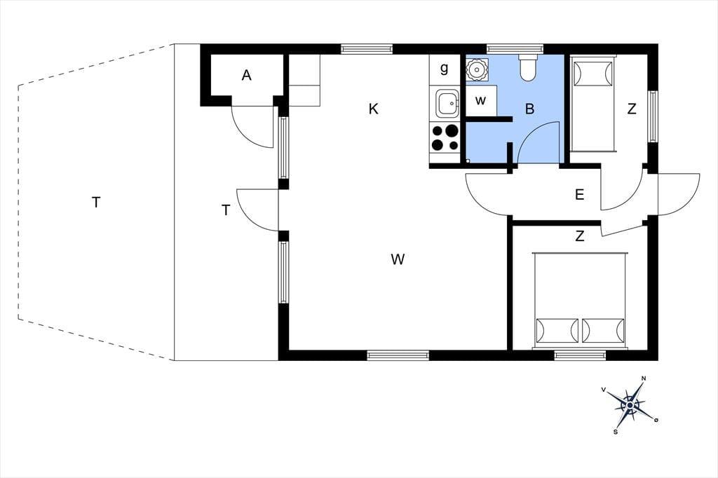 Dette skønne sommerhus byder på en entre, med indgang til husets to soveværelser. I det ene soveværelse er der en dobbeltseng, og i det andet soveværelse er der en enkeltmandsseng. Derudover har sommerhuset et badeværelse med wc, bruser og vaskemaskine. Til sidst byder huset på et åbent køkken, med spiseafdeling og stue, herfra er der udgang til husets skønne terrasse.