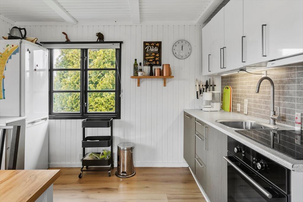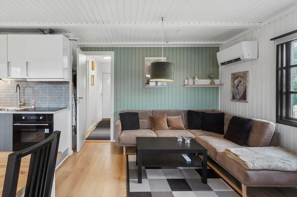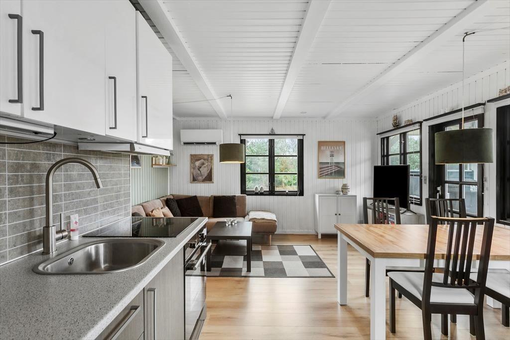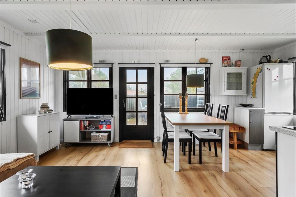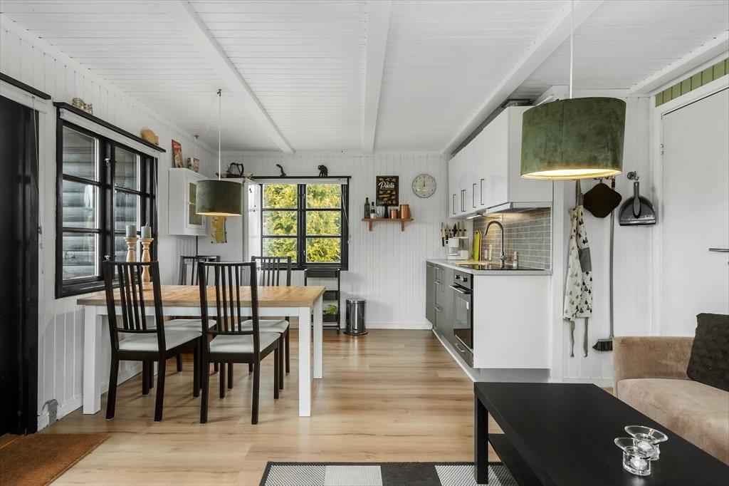 Dette skønne sommerhus byder på en entre, med indgang til husets to soveværelser. I det ene soveværelse er der en dobbeltseng, og i det andet soveværelse er der en enkeltmandsseng. Derudover har sommerhuset et badeværelse med wc, bruser og vaskemaskine. Til sidst byder huset på et åbent køkken, med spiseafdeling og stue, herfra er der udgang til husets skønne terrasse.
