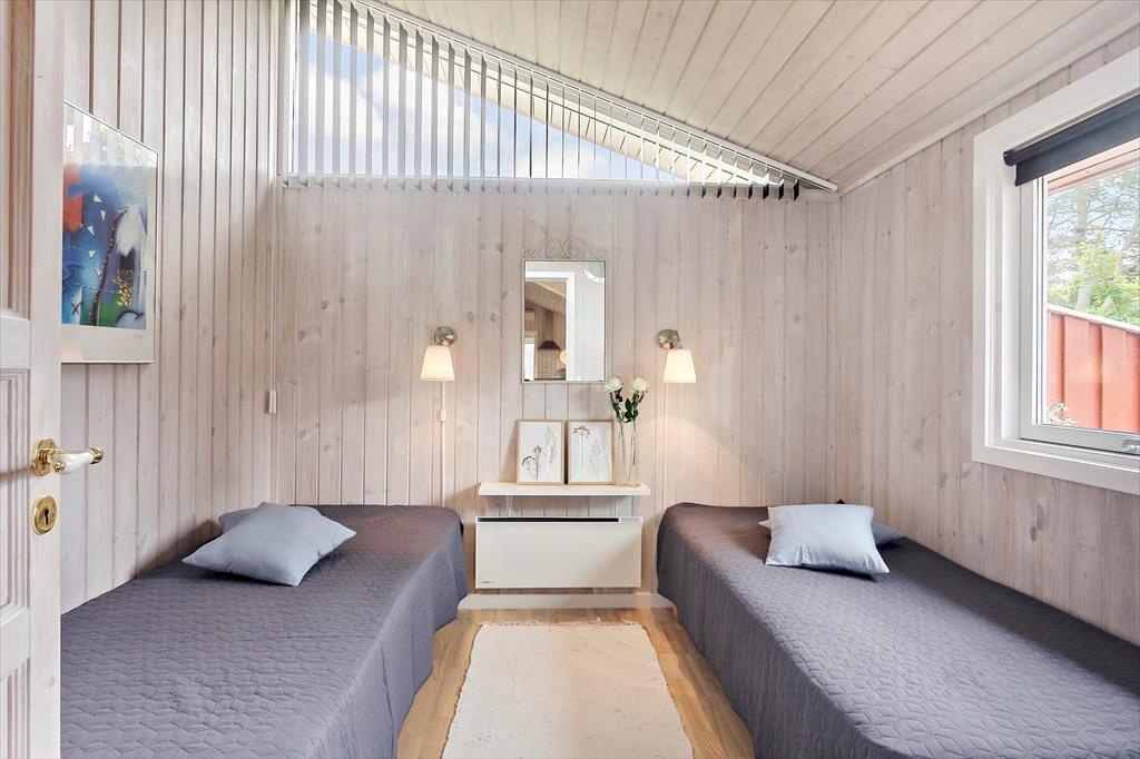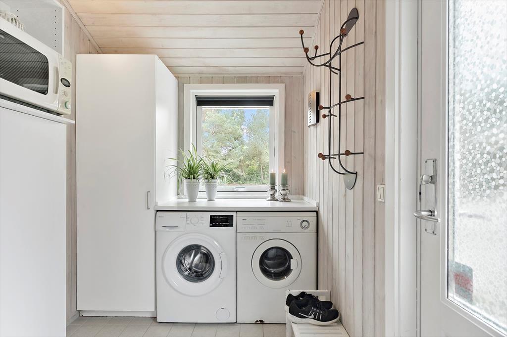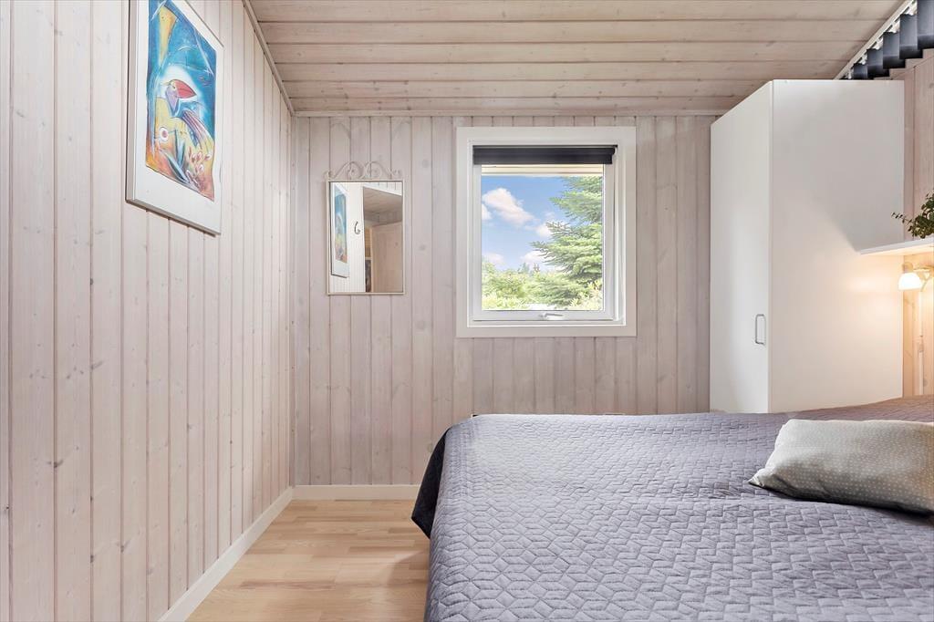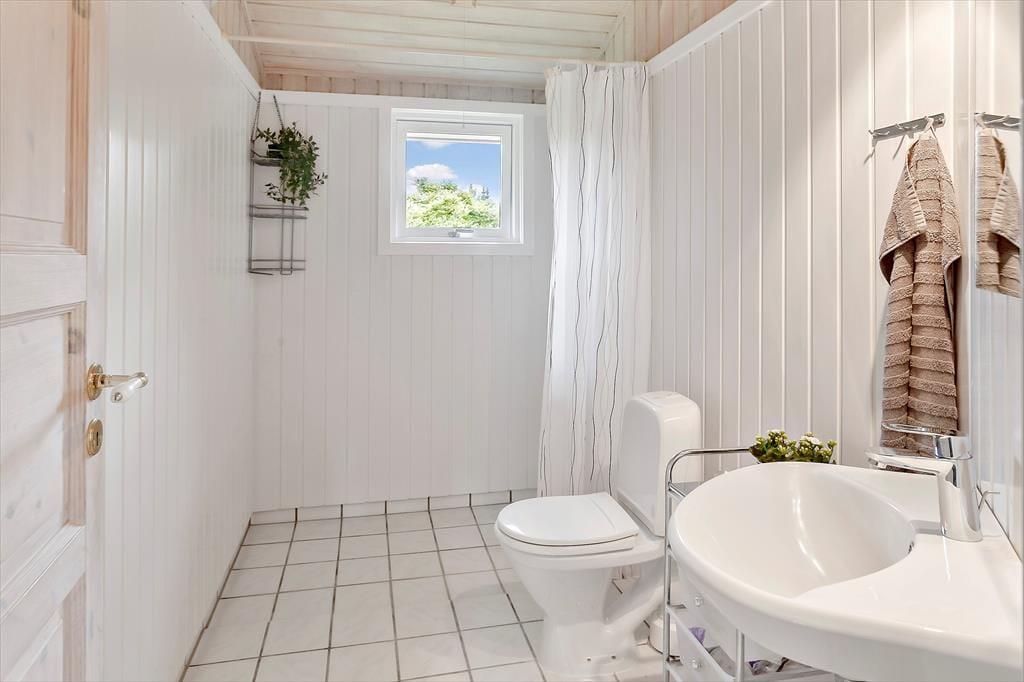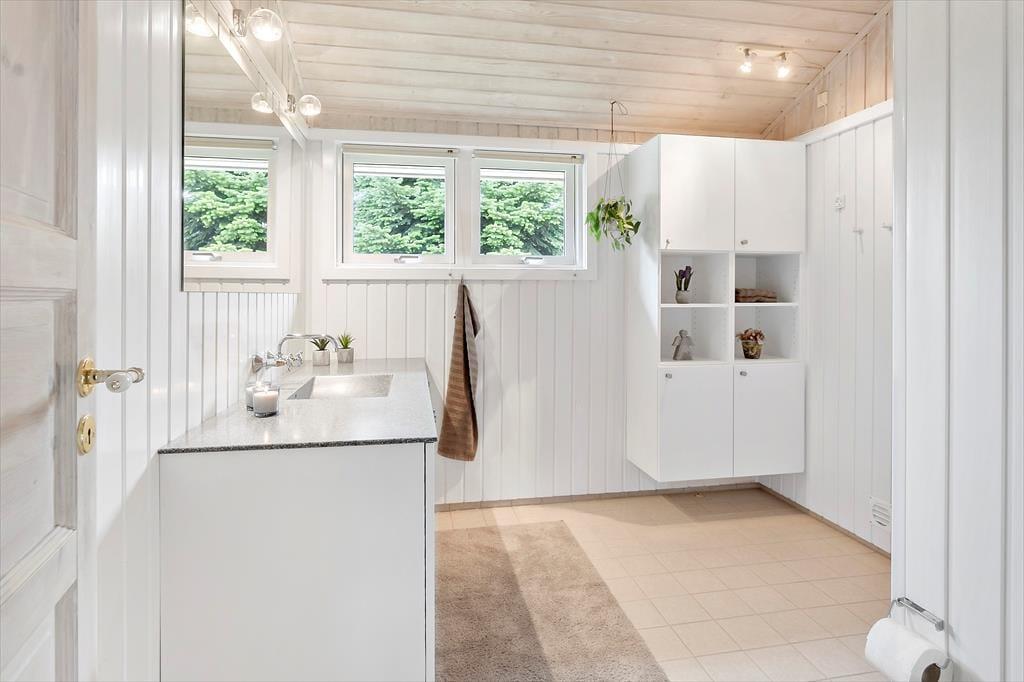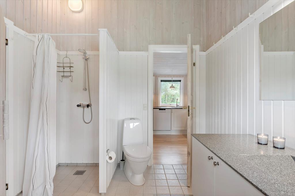 Dette skønne sommerhus byder på entre med vaskemaskine og tørretumbler. Dernæst er der to badeværelser, med wc og bruser i det ene, og wc, bruser og sauna i det andet. Huset har 5 gode soverum, med dobbeltseng i 3 af soveværelserne og 2 enkeltmandssenge i de 2 sidste soveværelser. Til sidst byder huset på det skønne køkken-alrum med udgang til spisestue og stue. Fra stuen er der udgang til husets overdækket terrasse og have.