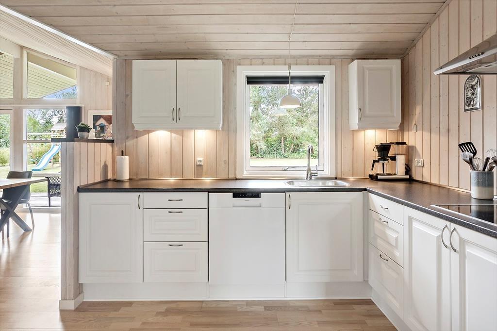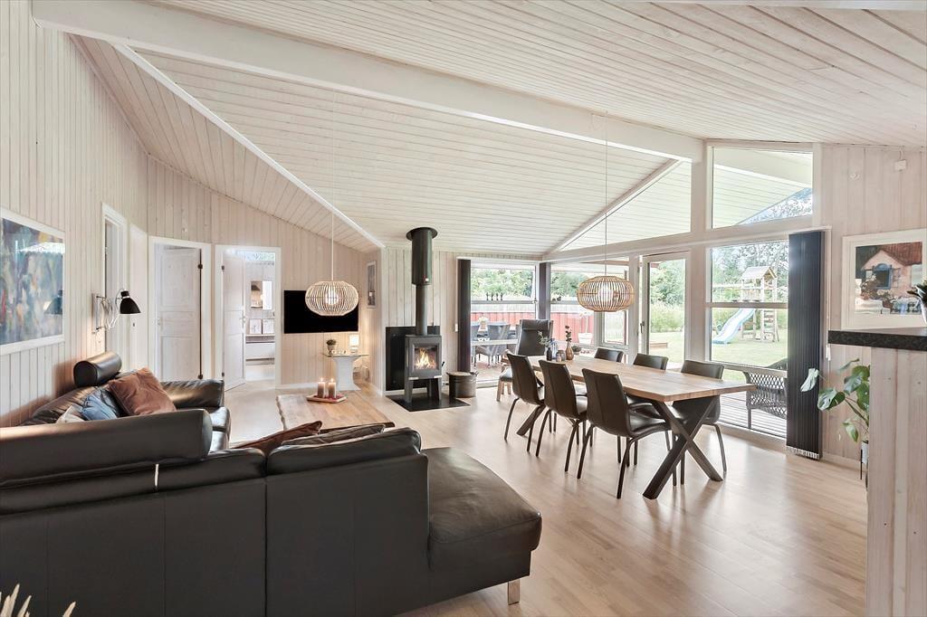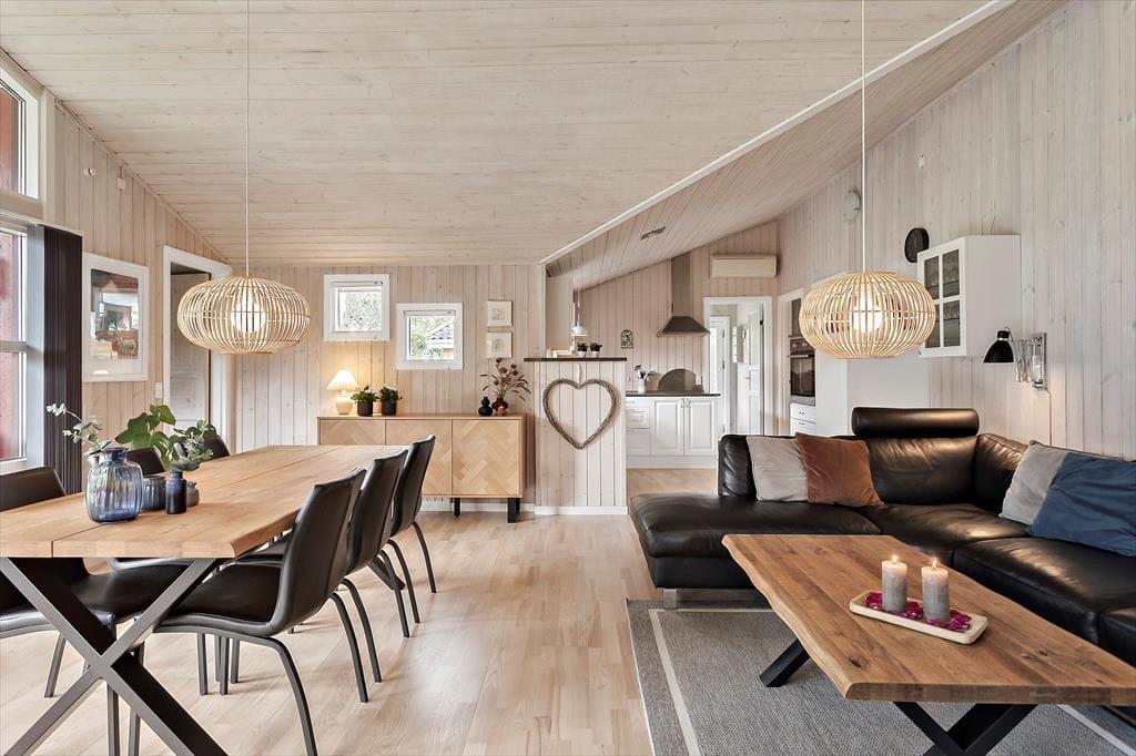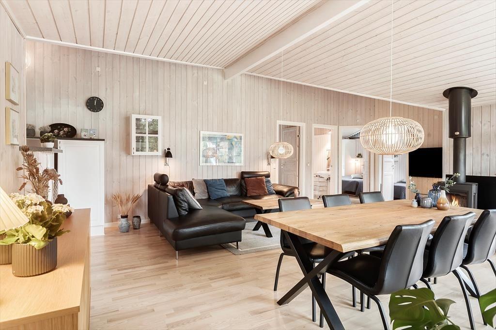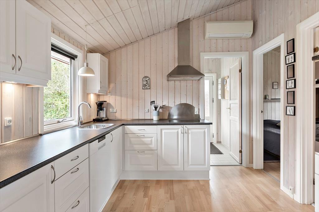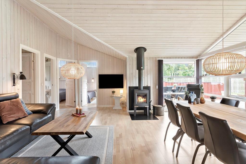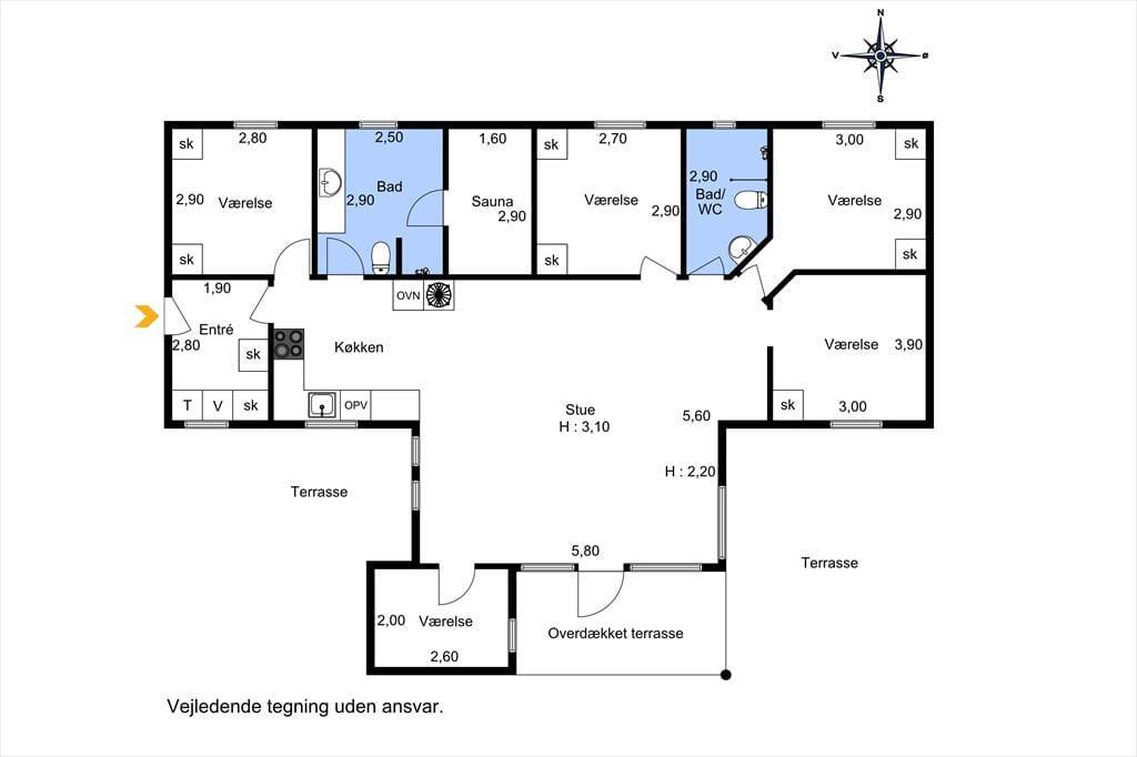 Dette skønne sommerhus byder på entre med vaskemaskine og tørretumbler. Dernæst er der to badeværelser, med wc og bruser i det ene, og wc, bruser og sauna i det andet. Huset har 5 gode soverum, med dobbeltseng i 3 af soveværelserne og 2 enkeltmandssenge i de 2 sidste soveværelser. Til sidst byder huset på det skønne køkken-alrum med udgang til spisestue og stue. Fra stuen er der udgang til husets overdækket terrasse og have.