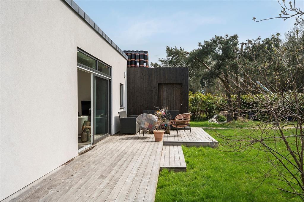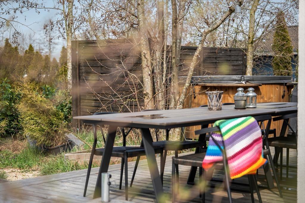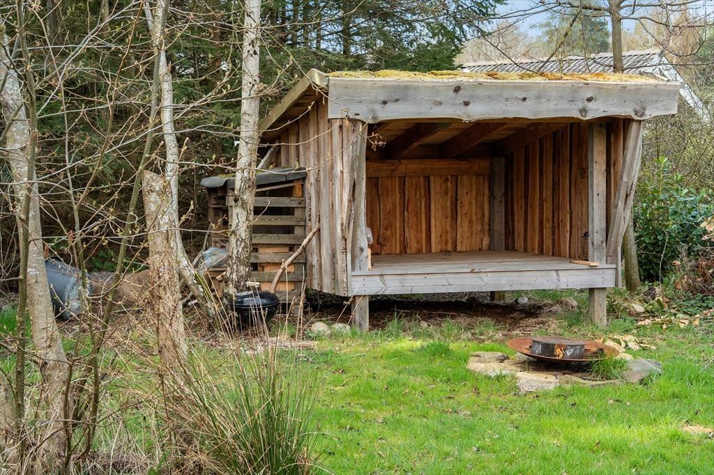 Sommerhuset er beliggende på en 1188 m² stor grund. Huset har en skøn terrasse med havemøbler og grill. Derudover er der en skøn have, hvor der er bål sted og shelter. Der er et vildmarksbad på terrassen, hvor lune aftner kan nydes. Der er parkering lige ved sommerhuset.
