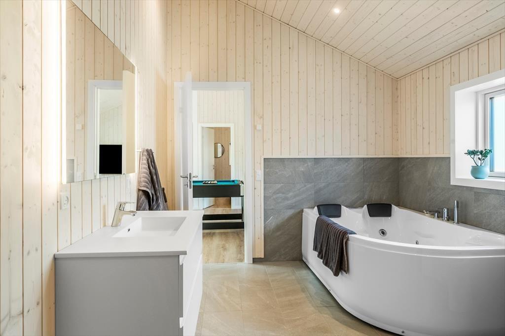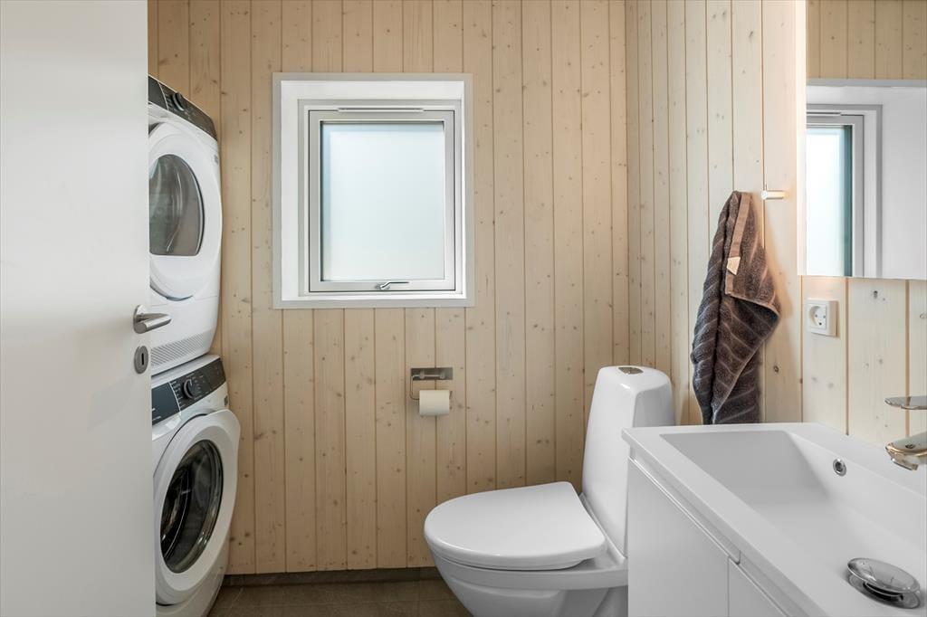 Der er to badeværelser i huset: Det ene byder på toilet, bruser, indendørs spabad og sauna, mens det andet er udstyret med toilet og bruser.
