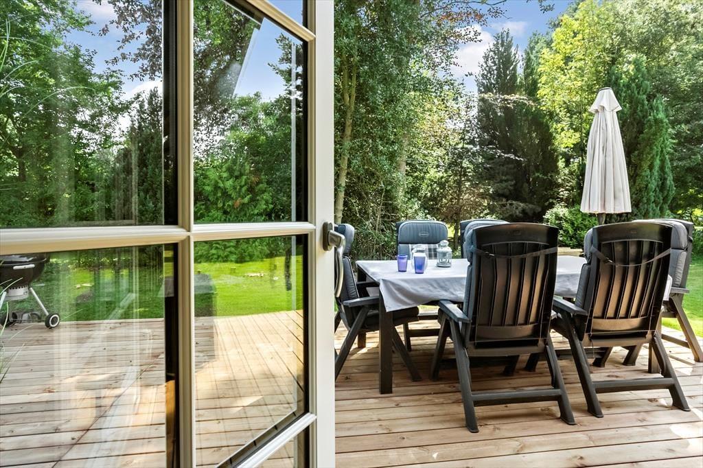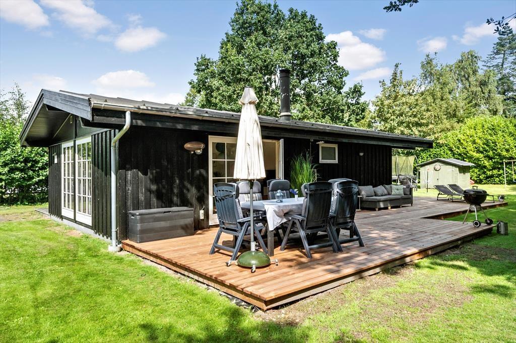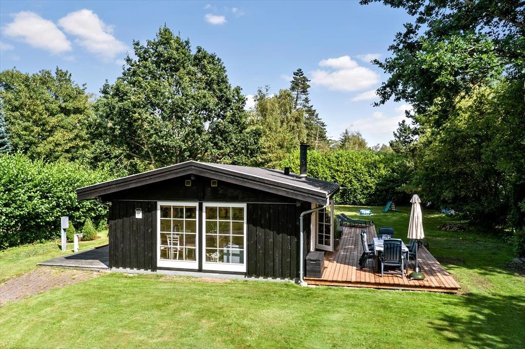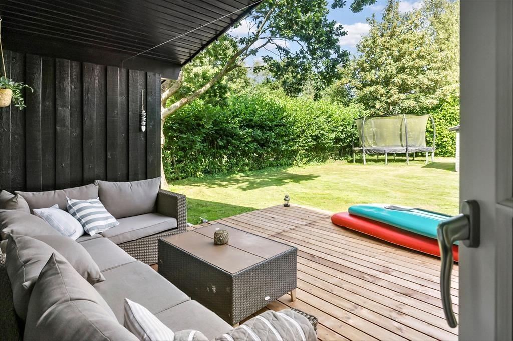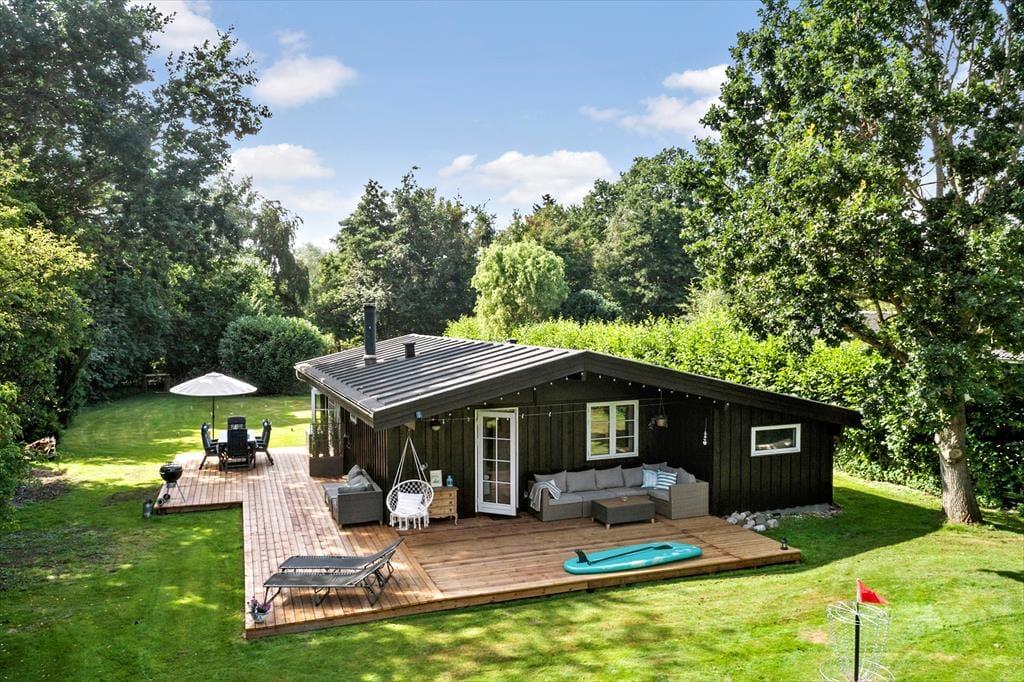 Sommerhuset er beliggende på en 1.262 m² stor grund og byder på en dejlig terrasse med havemøbler og grill – perfekt til afslappende stunder og hyggelige måltider under åben himmel. Grunden rummer også en stor græsplæne med masser af plads til leg, boldspil og udendørs aktiviteter for både børn og voksne.