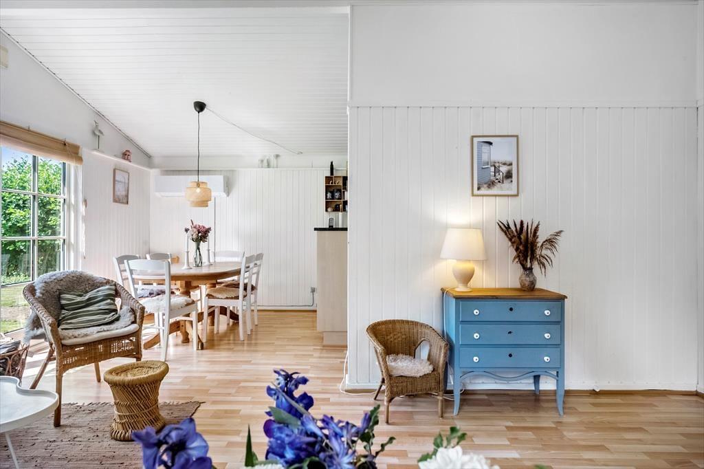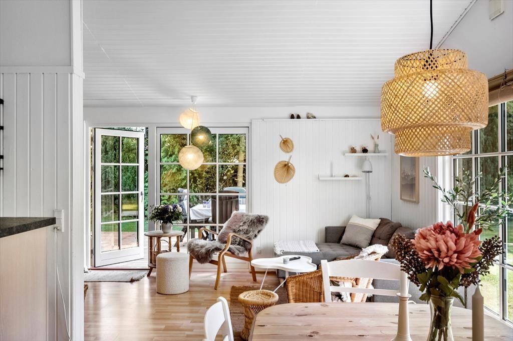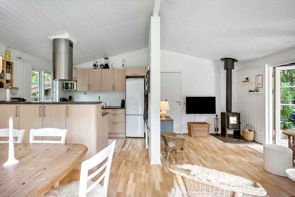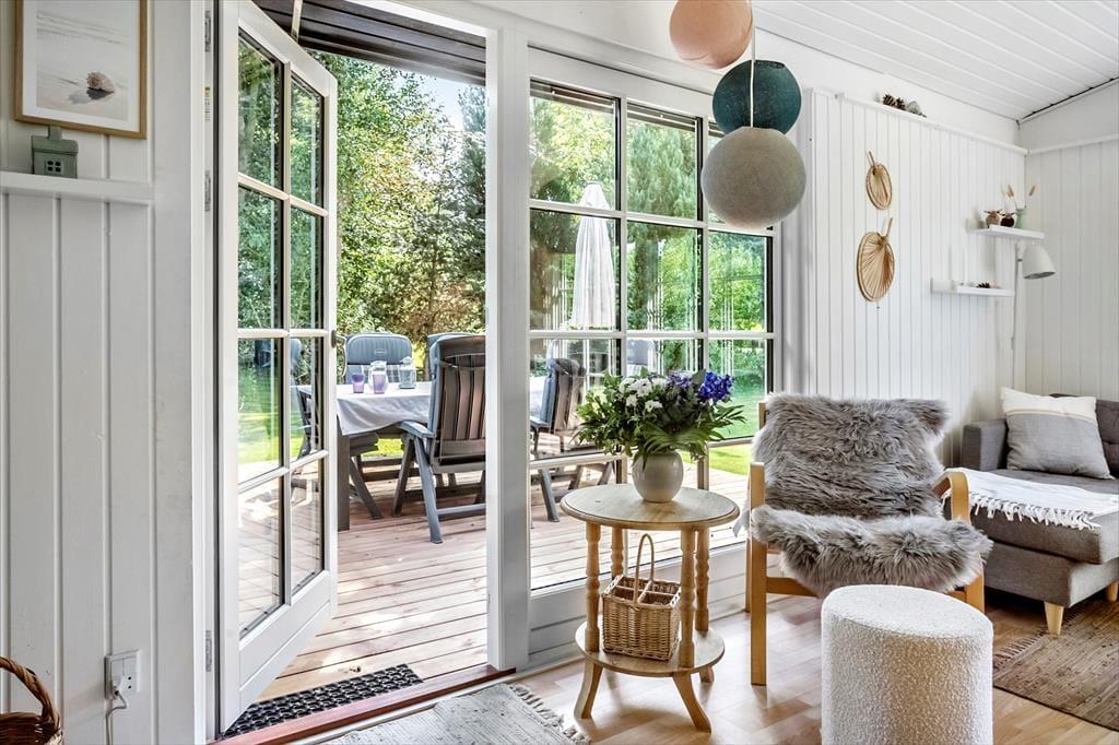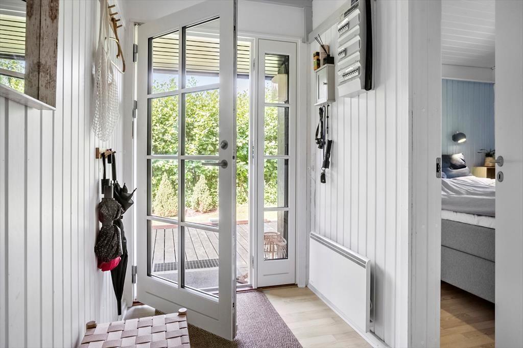 Dette charmerende sommerhus byder velkommen med en entré og rummer to rummelige soveværelser, begge indrettet med dobbeltsenge. Derudover findes et badeværelse med toilet og bruser. Hjertet i huset er det åbne køkken-alrum, hvor køkken, spiseplads og hyggeligt sofaområde smelter sammen – herfra er der direkte adgang til en skøn terrasse.