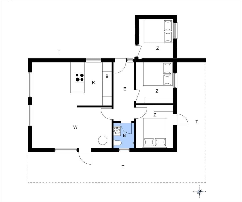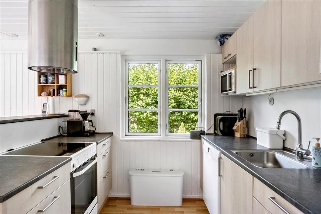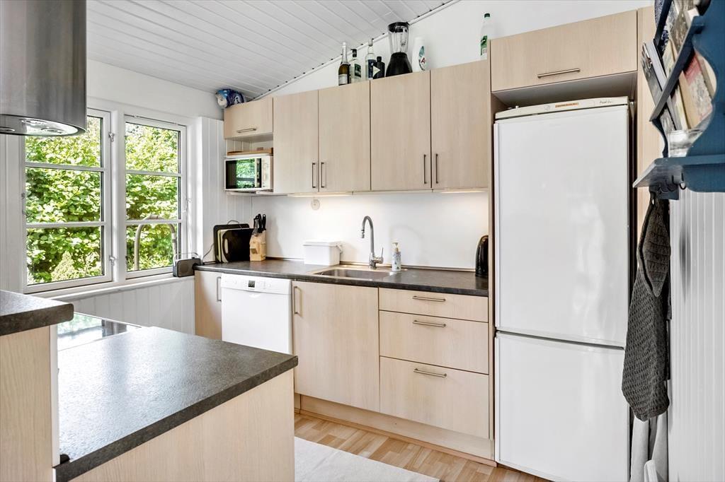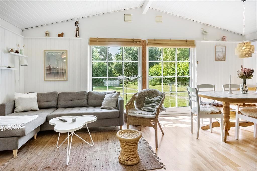 Dette charmerende sommerhus byder velkommen med en entré og rummer to rummelige soveværelser, begge indrettet med dobbeltsenge. Derudover findes et badeværelse med toilet og bruser. Hjertet i huset er det åbne køkken-alrum, hvor køkken, spiseplads og hyggeligt sofaområde smelter sammen – herfra er der direkte adgang til en skøn terrasse.