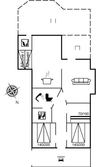 Der er i alt 3 soveværelser. Sovepladserne fordeler sig på: 4 sovepladser i dobbeltsenge. 2 sovepladser i køjeseng. 2 sovepladser i alkove. 2 af disse sovepladser befinder sig i stuen. Derudover er der 1 stk. barneseng.