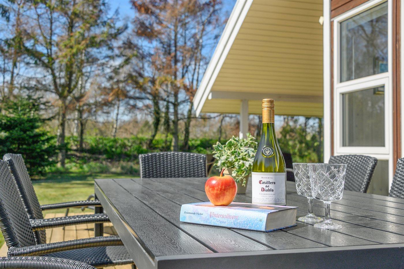 Ferieboligen er beliggende på en 1112 m² stor naturgrund. Der er 650 m til havet. Nærmeste forretning er beliggende i en afstand af 400 m. Til ferieboligen hører 20 m² terrasseareal. Desuden er der 12 m² overdækket terrasse. Der er redskabsrum. Der er carport til rådighed. Parkering ved ferieboligen.
