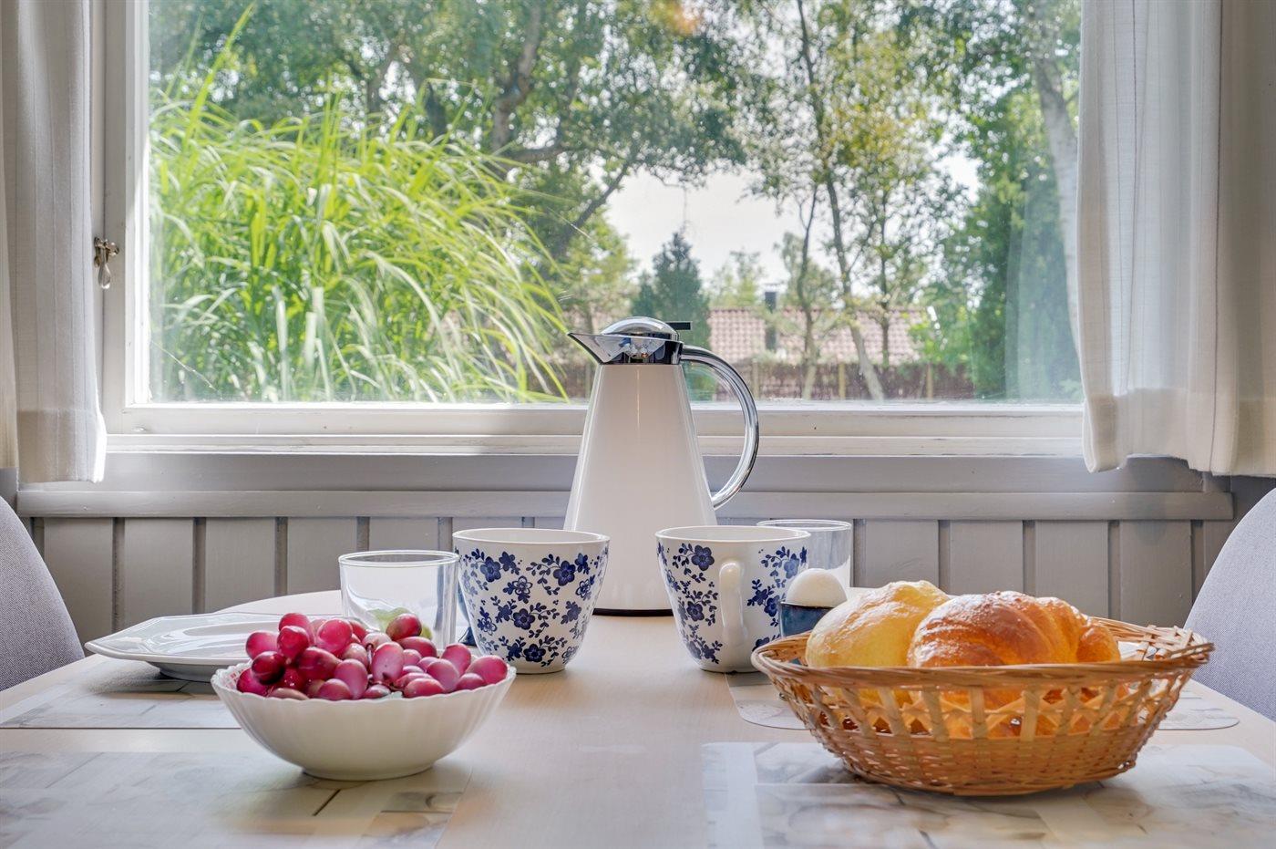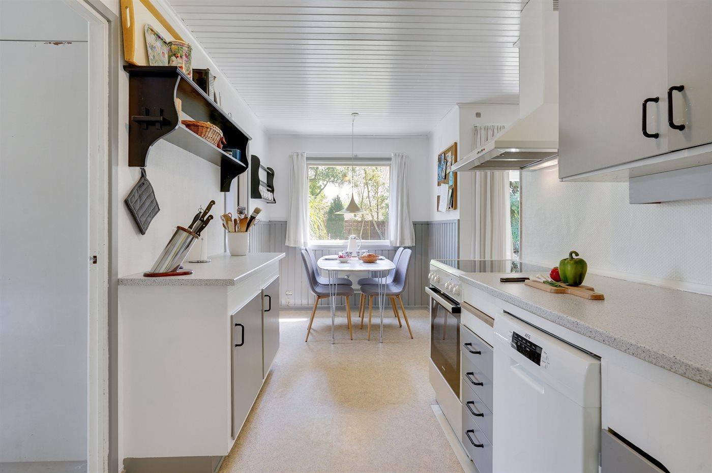 Køkkenet er udstyret med 1 køleskab. Der er 4 elkogeplader, varmluftovn samt opvaskemaskine.