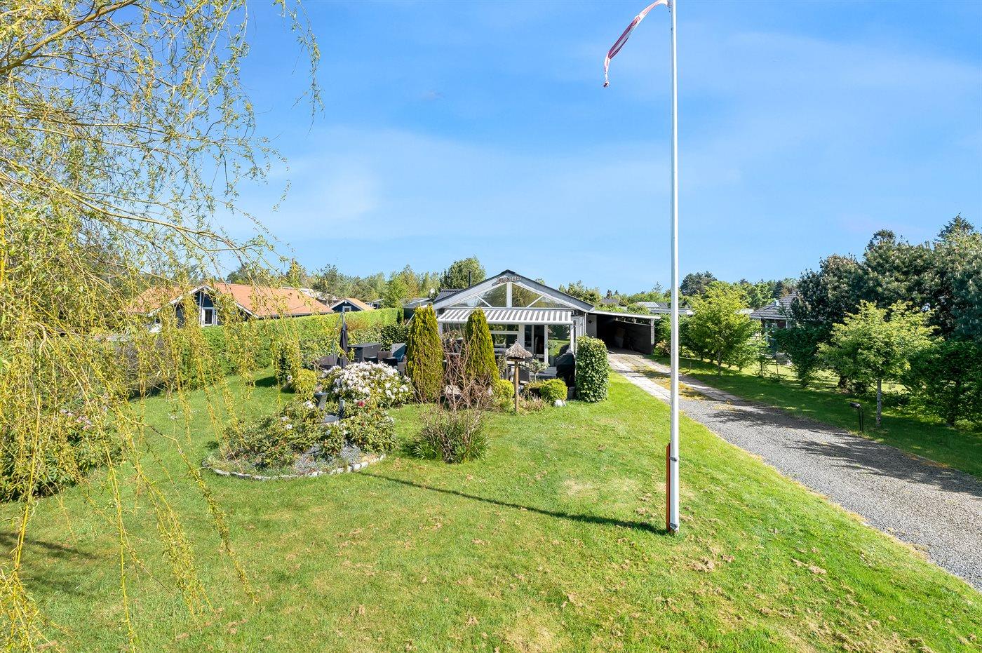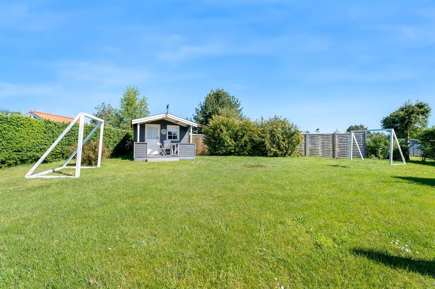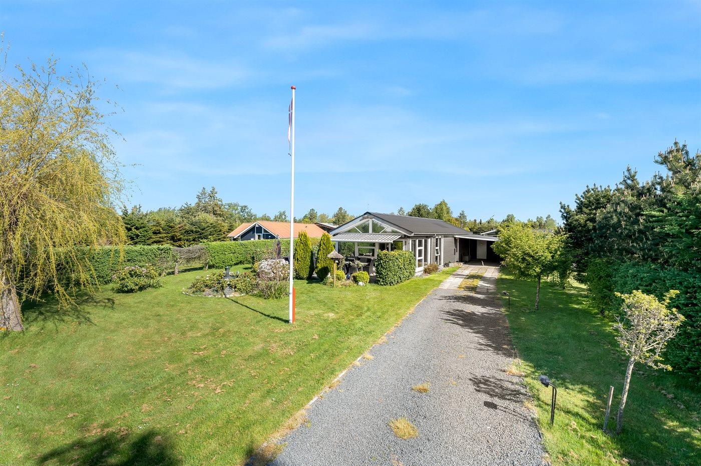 Ferieboligen er beliggende på en 1100 m² stor havegrund. Der er 600 m til havet. Nærmeste forretning er beliggende i en afstand af 600 m. Til ferieboligen hører åbent terrasseareal og en markise. Trampolin. Fodboldmål. Gasgrill står til rådighed. Der er carport til rådighed. Parkering ved ferieboligen.