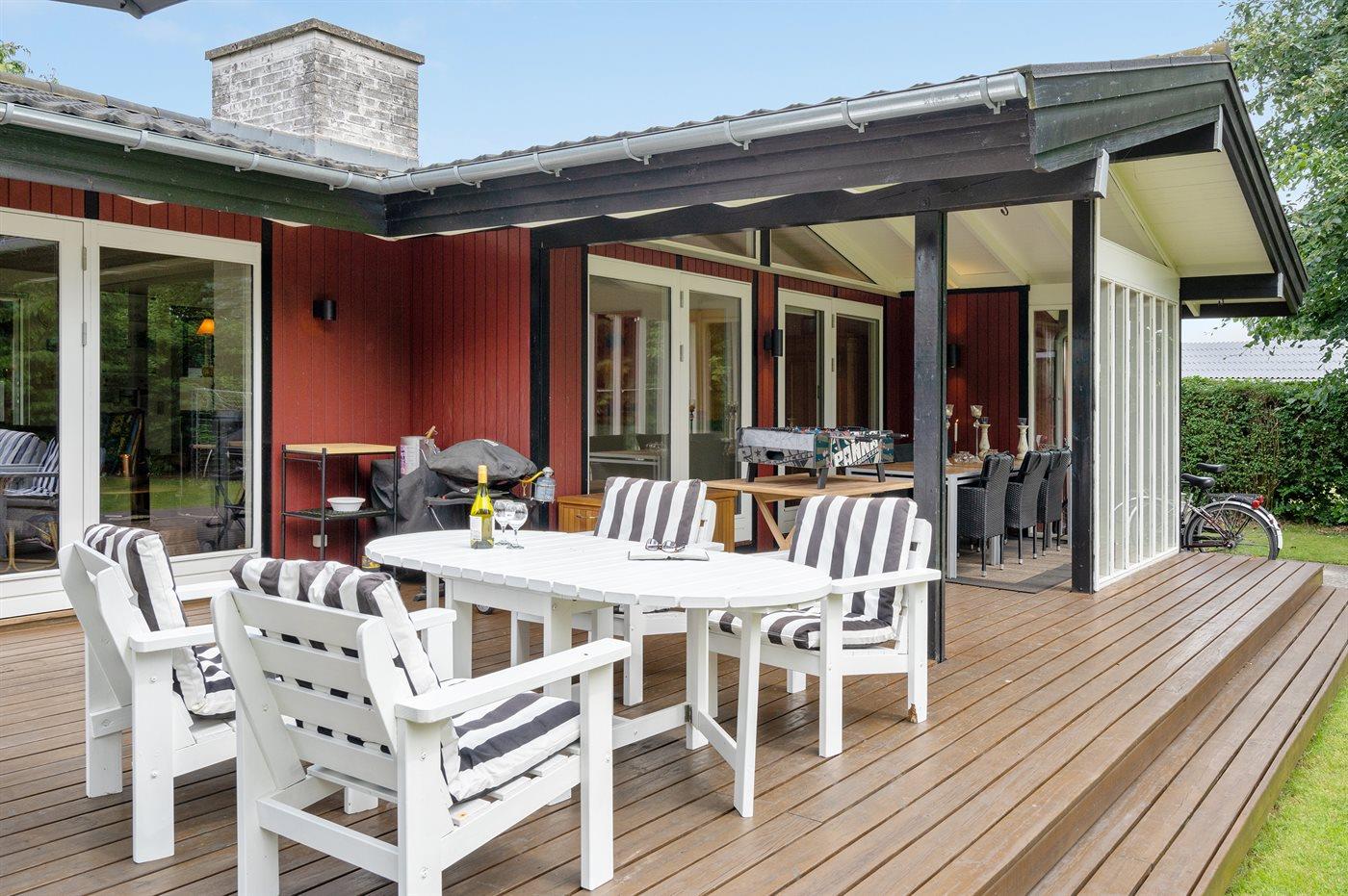 Ferieboligen er beliggende på en 1500 m² stor naturgrund. Der er 800 m til havet. Nærmeste forretning er beliggende i en afstand af 400 m. Til ferieboligen hører 40 m² terrasseareal. Desuden er der 25 m² overdækket terrasse. Der er redskabsrum. Grill til rådighed. Parkering ved ferieboligen.