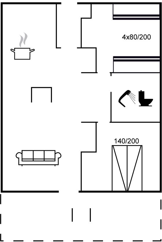 Der er i alt 2 soveværelser. Sovepladserne fordeler sig på: 2 sovepladser i dobbeltseng. 4 sovepladser i køjesenge. Derudover er der 1 stk. barneseng.