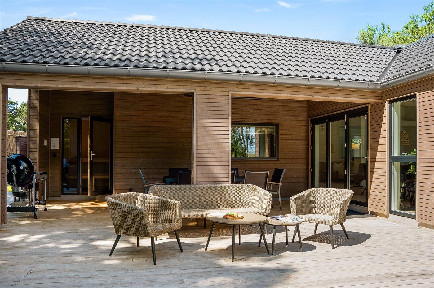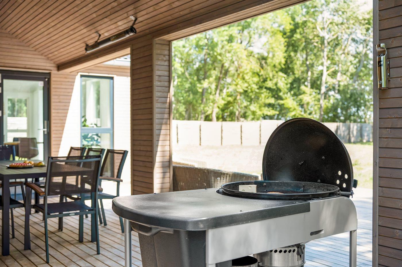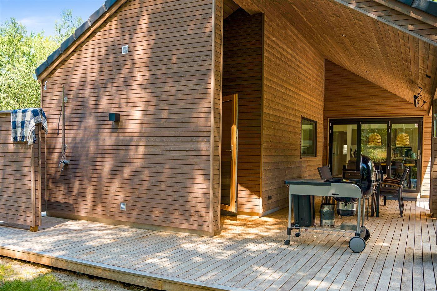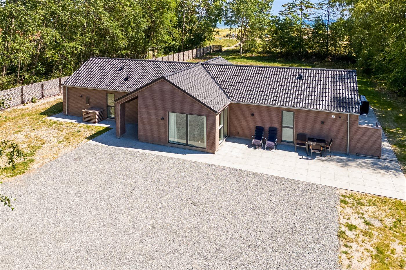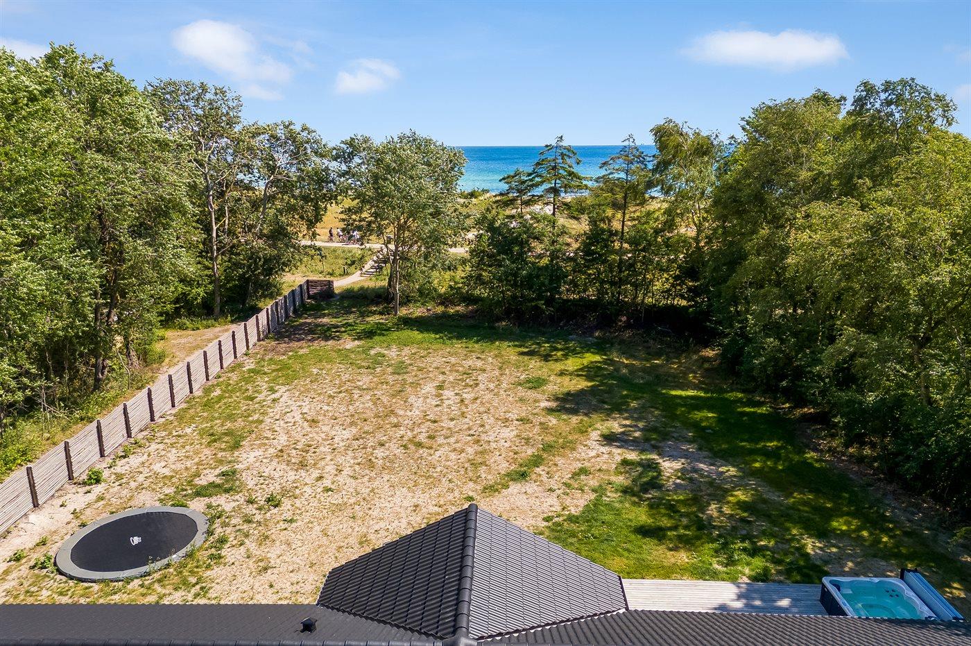Ferieboligen er beliggende på en 2028 m² stor naturgrund. Der er 80 m til havet. Nærmeste forretning er beliggende i en afstand af 250 m. Til ferieboligen hører åbent terrasseareal. Desuden er der overdækket terrasse. Der er redskabsrum. Trampolin. Udendørs bruser. Grill til rådighed. Der er carport til rådighed. Der er installeret stik til opladning af elbil. CEE stik. Med 11 kW ladeeffekt. Parkering ved ferieboligen.