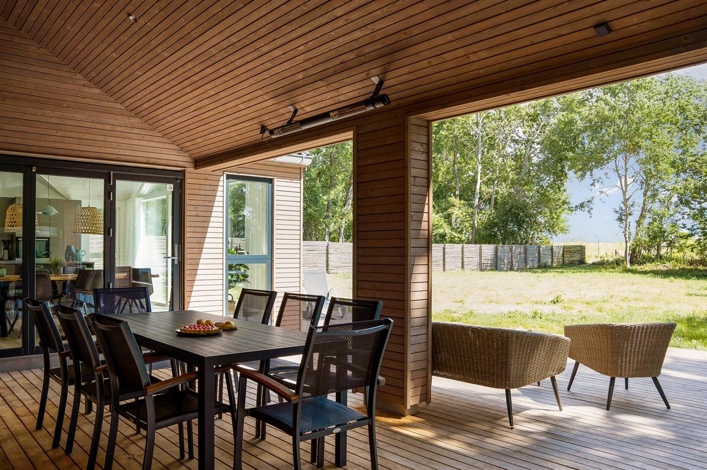 Nybygget sommerhus ved Marielyst med spa, sauna og havudsigt, perfekt til en afslappende ferie ved stranden.