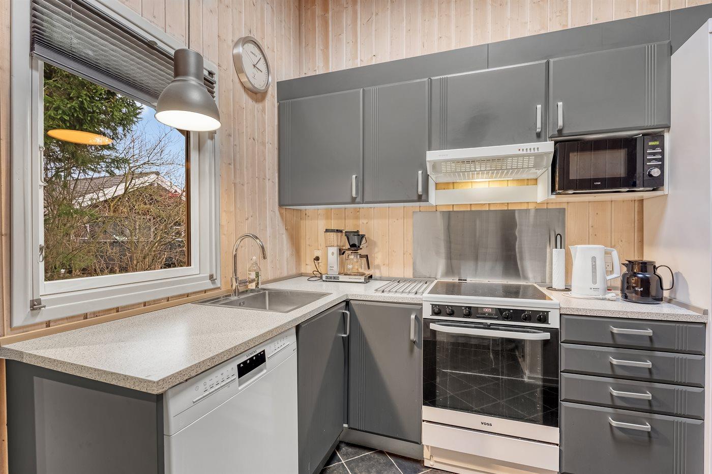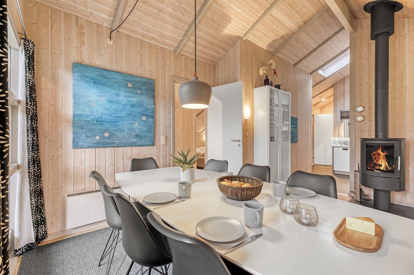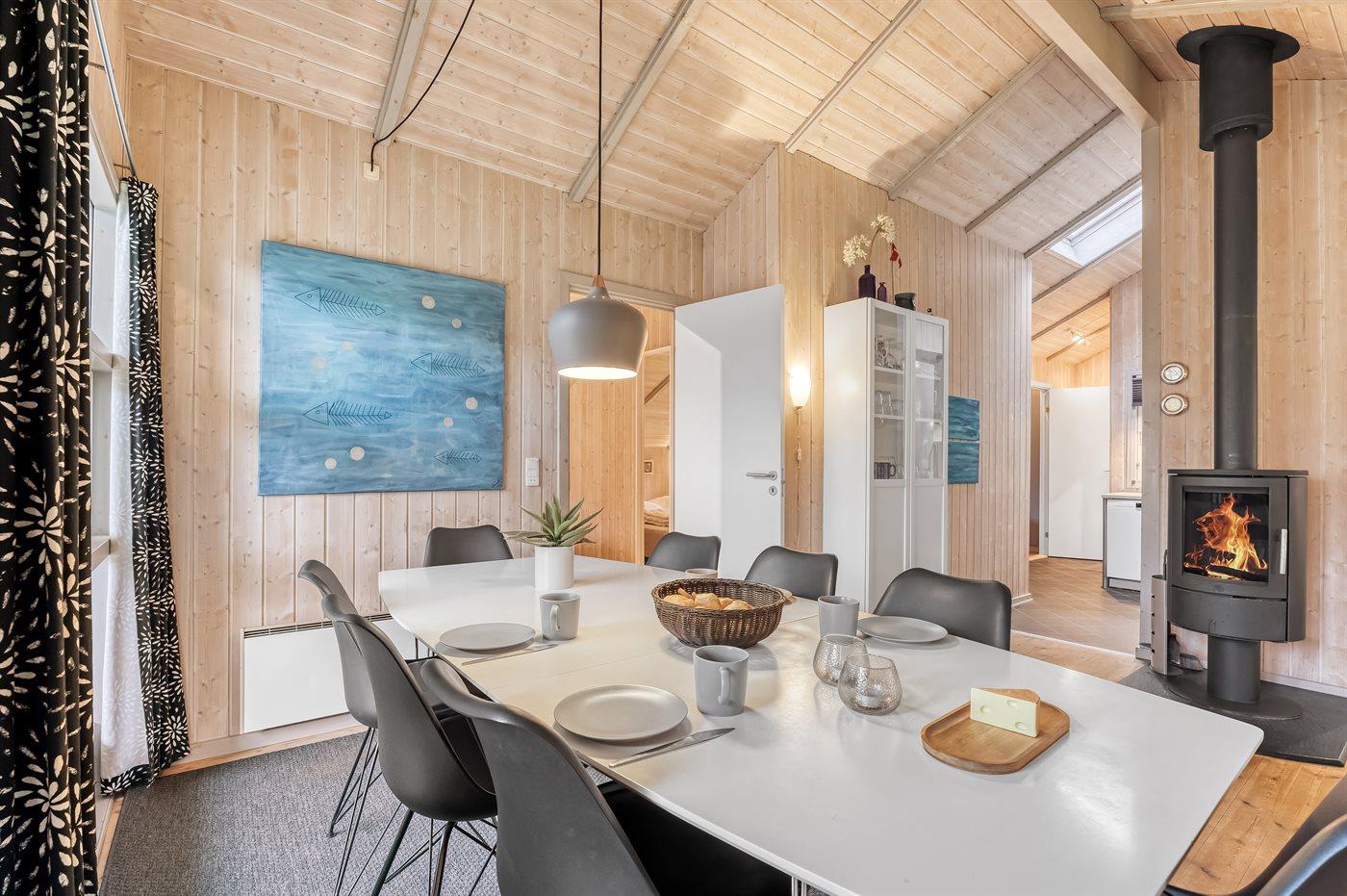 Huset ligger på en tilplantet naturgrund med ugenert solgård samt dejlig terrasse med havemøbler. Det store indbydende badeværelse med opvarmet marmorgulv er indrettet med 2-pers. spa, bruseniche, vaskemaskine og direkte adgang til husets sauna. Desuden gæstetoilet. Dejligt køkken med køle/ frys opvaskemaskine og mikrobølgeovn. Flot møbleret opholdsstue, brændeovn, 65 tommer smart TV, Sony Playstation, Bluetooth højtaler, trådløs fiber internetforbindelse (egen computer skal medbringes). 4 soverum; 2 med dobbelt kontinentalsenge, 1 med 2 enkeltsenge og 1 med dobbeltseng (bredde 140 cm). Der er barneseng, høj barnestol, gynge og sandkasse. Huset er udstyret med solvarmeanlæg.