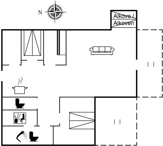 Der er 1 badeværelse med bruseniche og 2 toiletter, heraf 1 gæstetoilet I saunaen er der mulighed for afslapning.