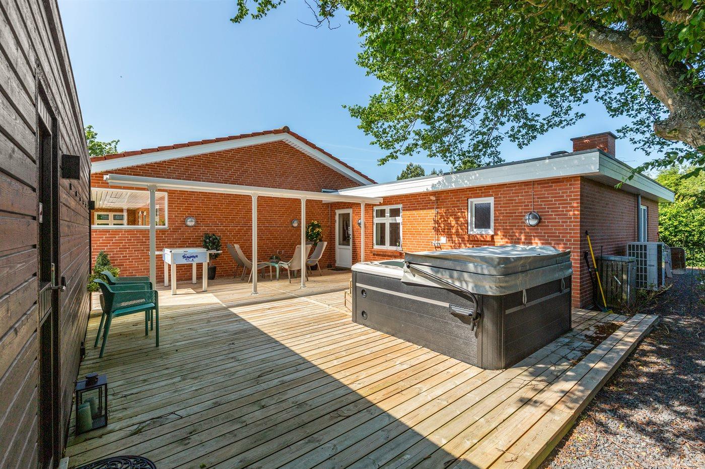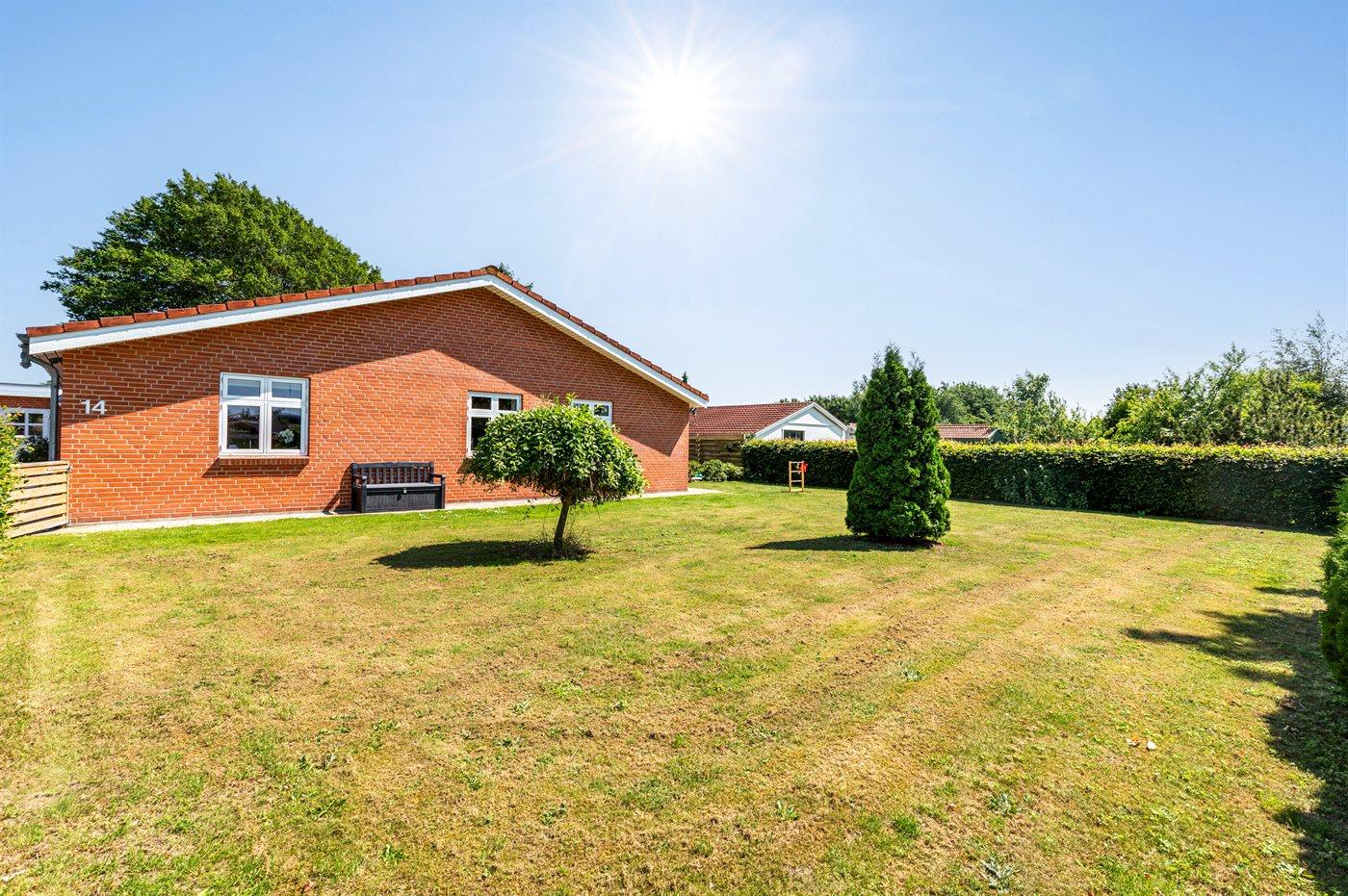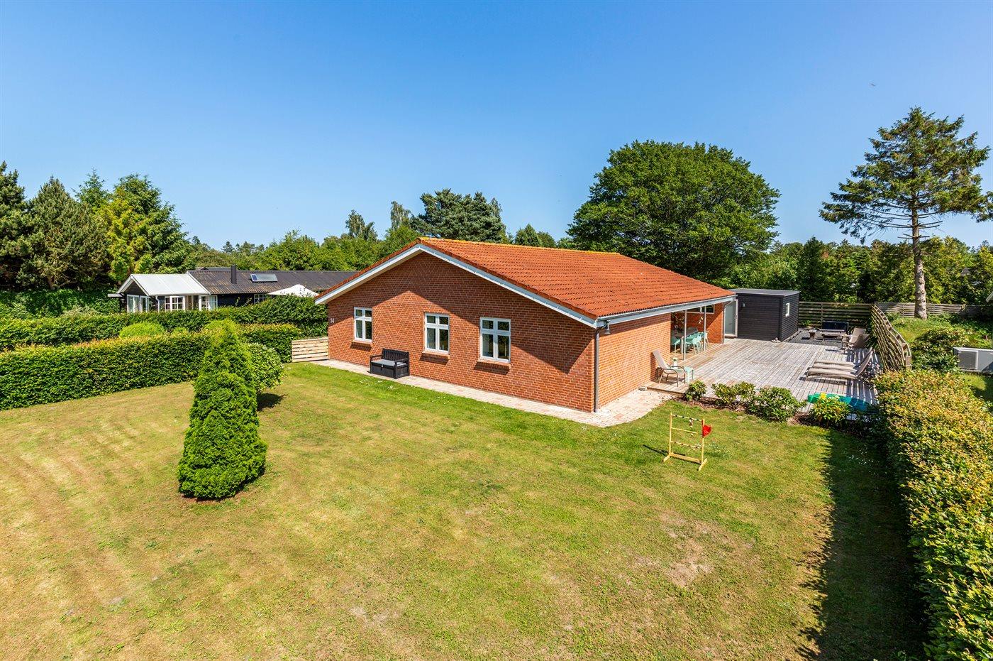 Ferieboligen er beliggende på en 946 m² stor havegrund. Grunden er indhegnet. Der er 540 m til havet. Nærmeste forretning er beliggende i en afstand af 240 m. Til ferieboligen hører åbent terrasseareal. Desuden er der overdækket terrasse. Sandkasse. Bålsted. Udendørs sauna. Udendørs bruser. Grill til rådighed. Der er installeret stik til opladning af elbil. Type 2 stik. Med 11 kW ladeeffekt. Parkering ved ferieboligen.
