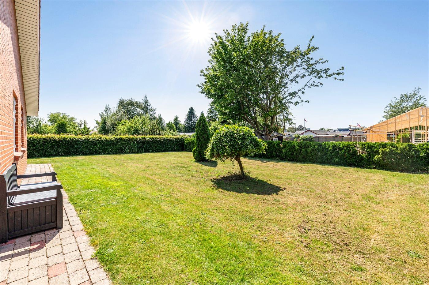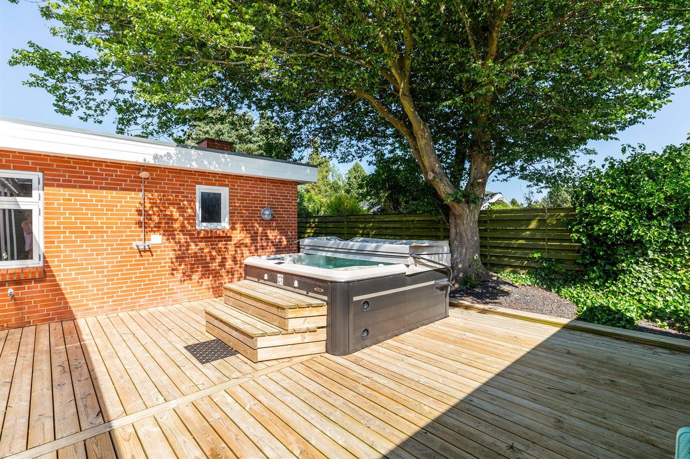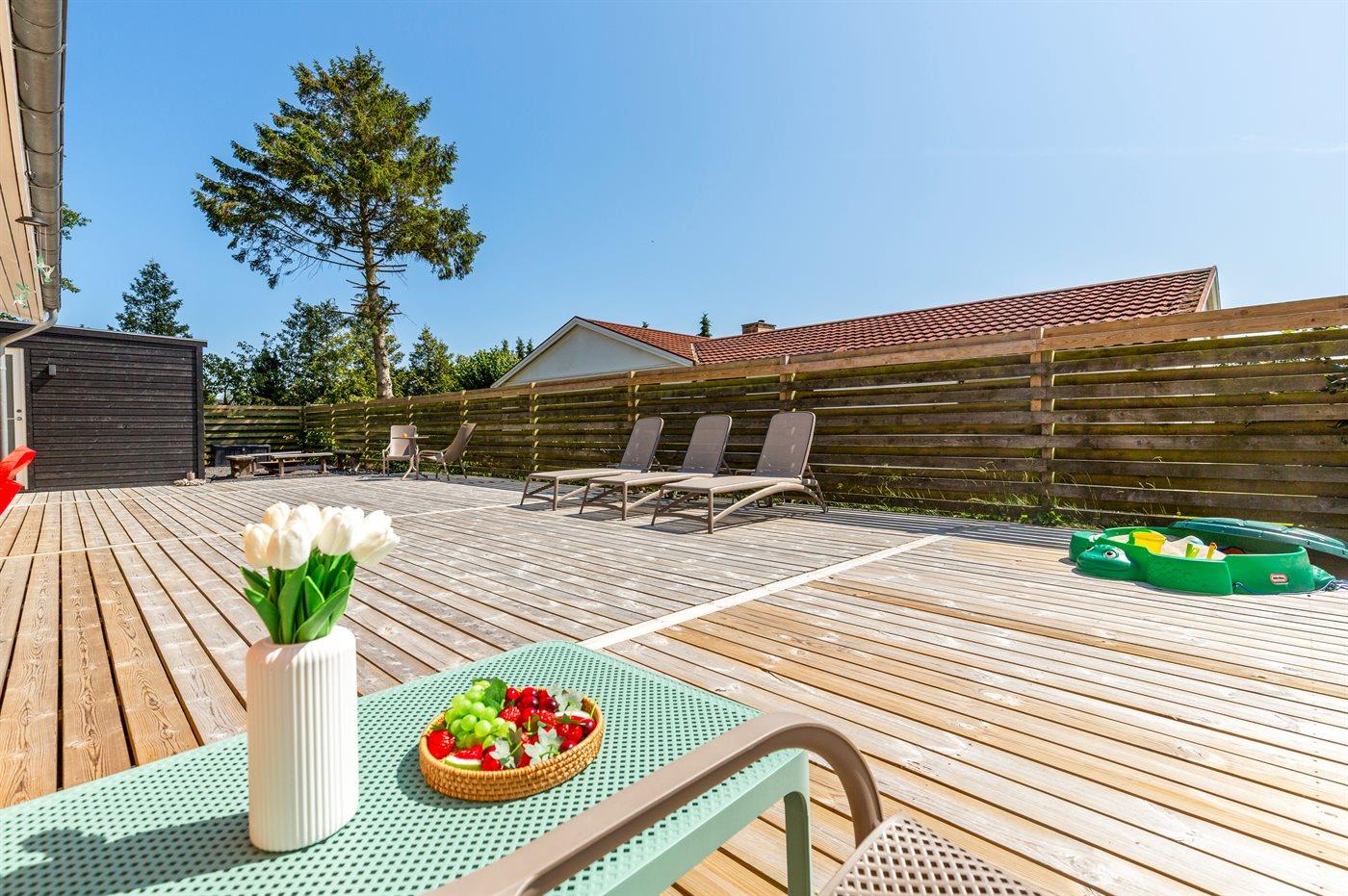 Ferieboligen er beliggende på en 946 m² stor havegrund. Grunden er indhegnet. Der er 540 m til havet. Nærmeste forretning er beliggende i en afstand af 240 m. Til ferieboligen hører åbent terrasseareal. Desuden er der overdækket terrasse. Sandkasse. Bålsted. Udendørs sauna. Udendørs bruser. Grill til rådighed. Der er installeret stik til opladning af elbil. Type 2 stik. Med 11 kW ladeeffekt. Parkering ved ferieboligen.