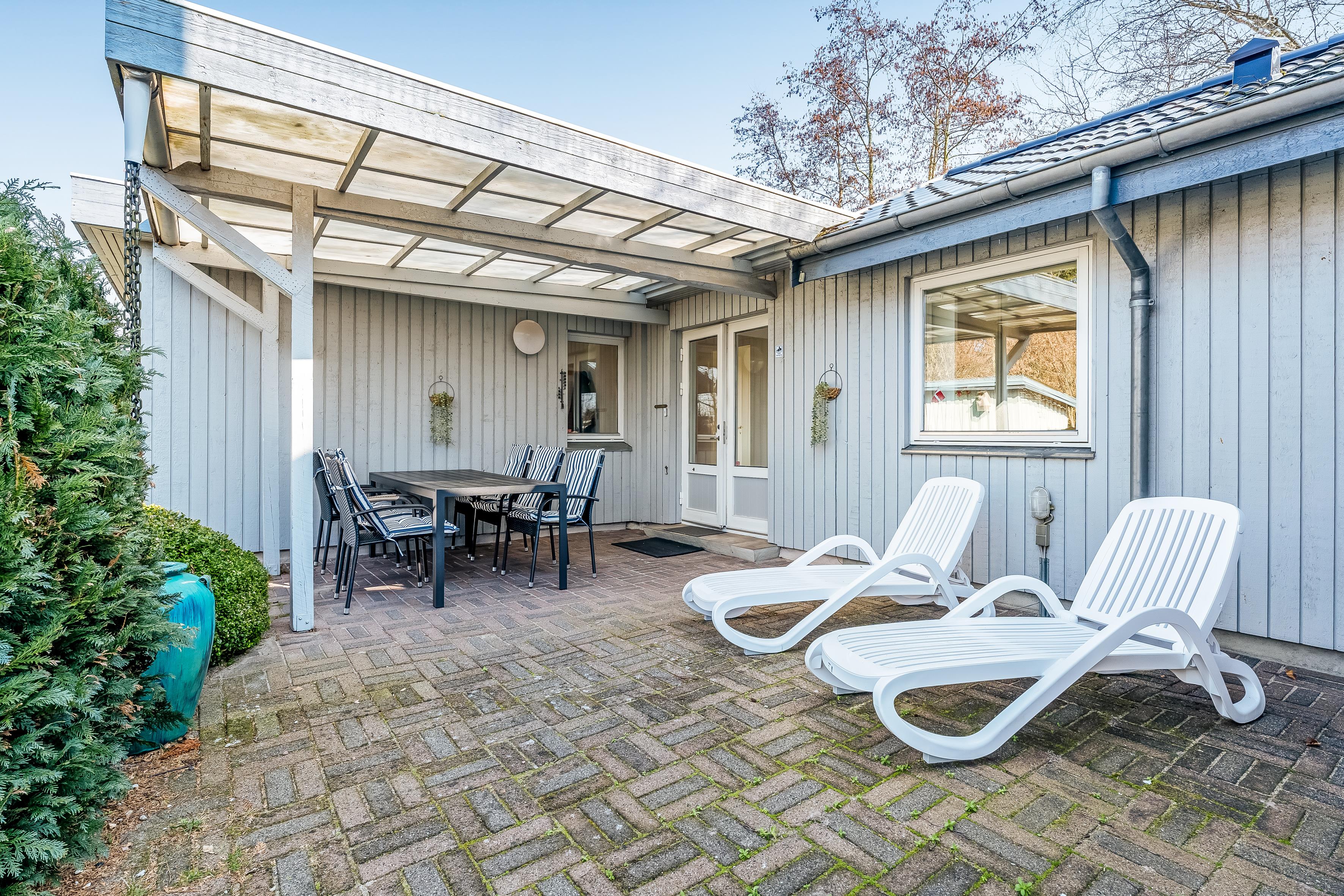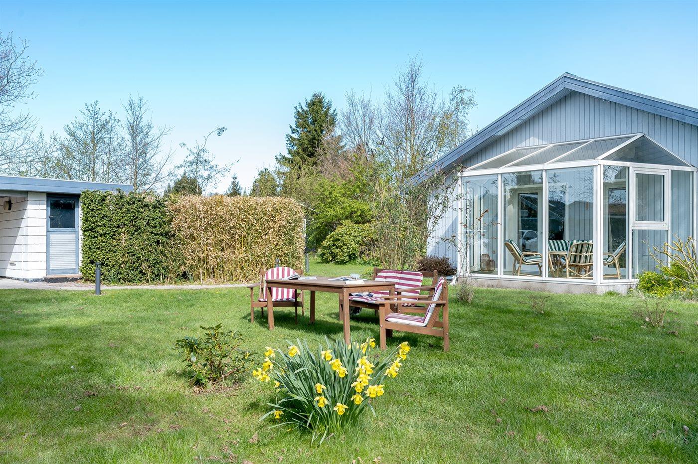 Ferieboligen er beliggende på en 1104 m² stor naturgrund. Der er 750 m til havet. Der er en golfbane i en afstand af 350 m. Til ferieboligen hører åbent terrasseareal. Desuden er der overdækket terrasse. Ligeledes er der adgang til udestue. Grill til rådighed. Der er carport til rådighed. Der er plads til 3 biler i indkørslen.