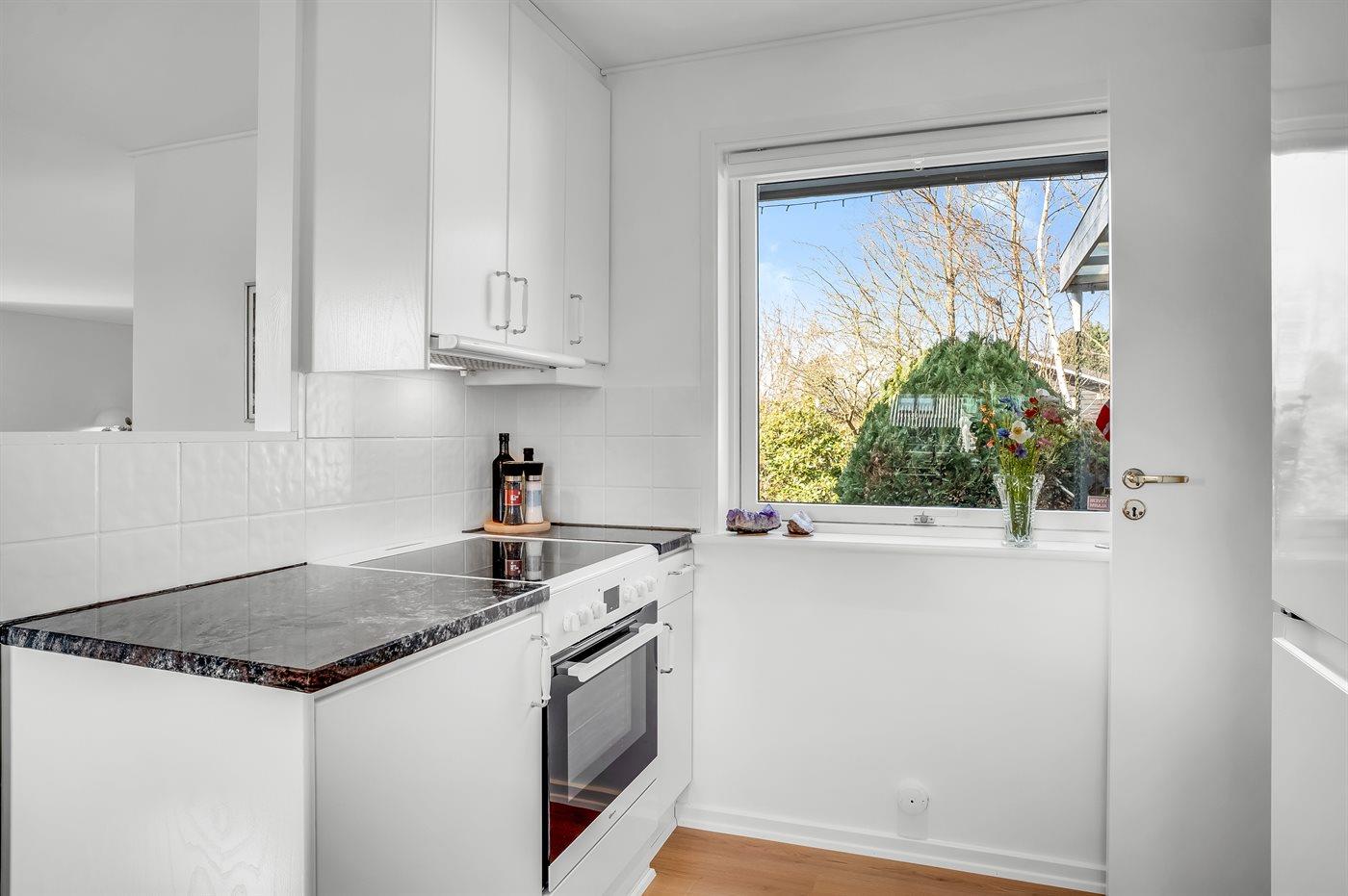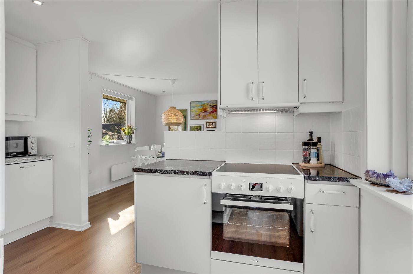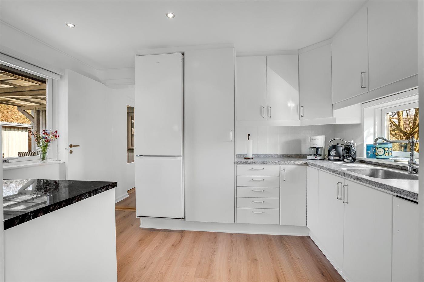 Køkkenet er udstyret med 1 køleskab. Der er 4 keramiske kogeplader, varmluftovn, mikrobølgeovn, Airfryer samt opvaskemaskine.