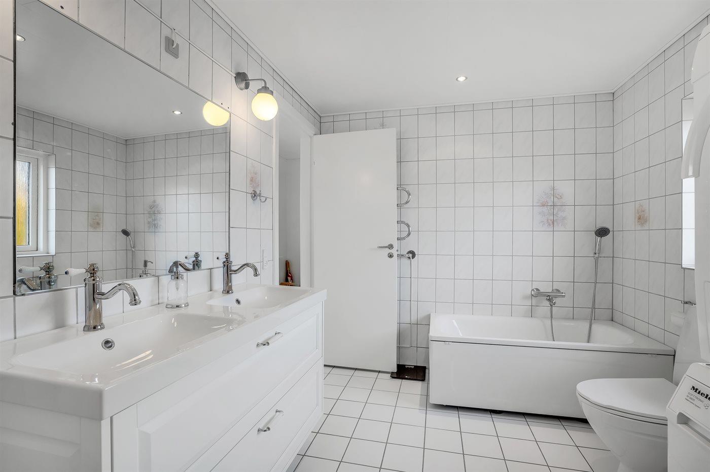 Der er 1 badeværelse med bruseniche og 2 toiletter, heraf 1 gæstetoilet. Der er gulvvarme på 1 badeværelse.. Badekar.