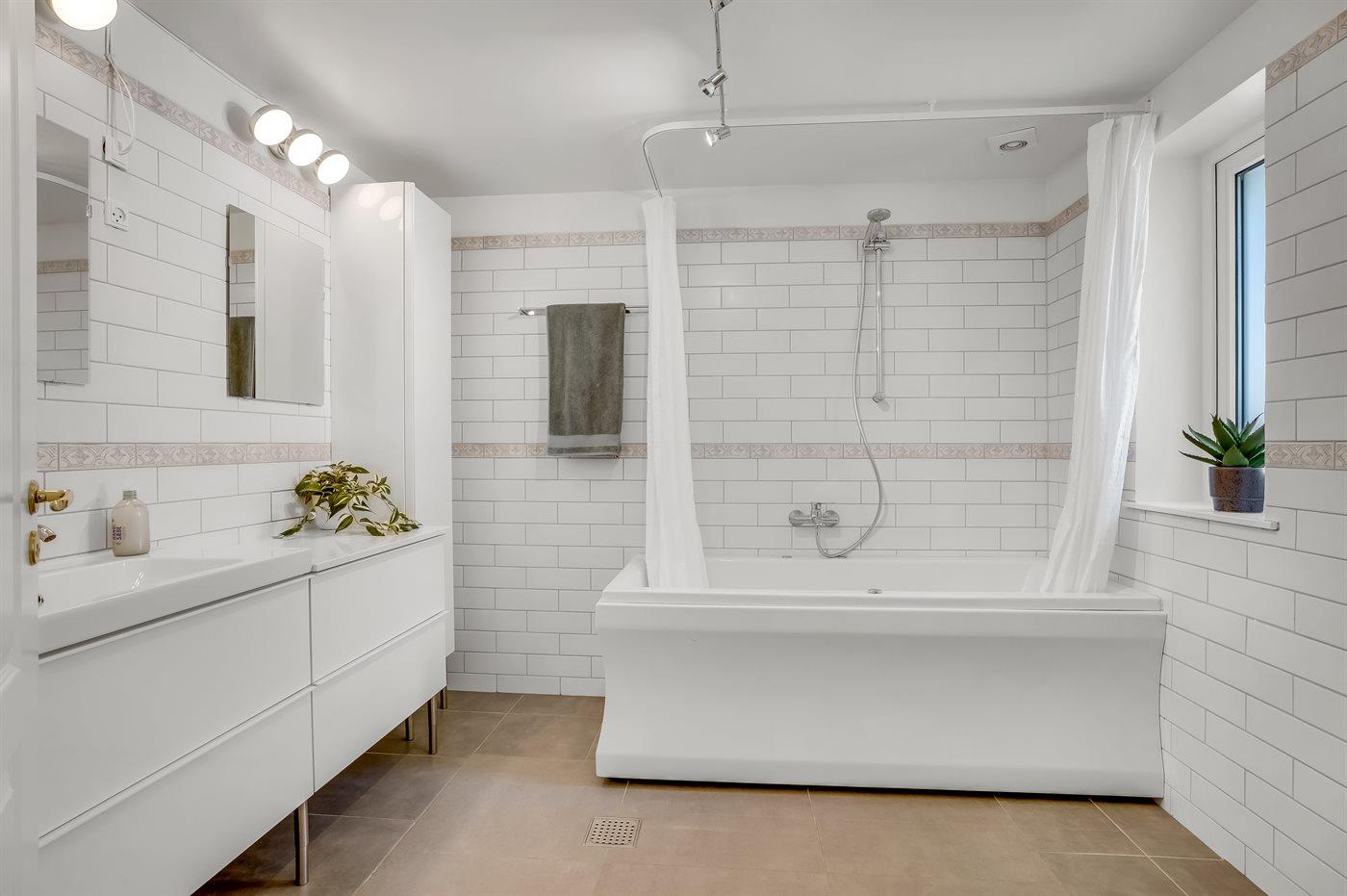 Der er 1 badeværelse med gulvvarme, badekar samt håndbruser og 1 badeværelse med gulvvarme og bruseniche.