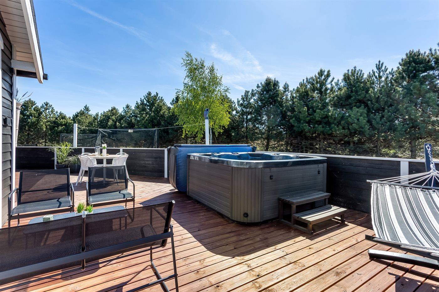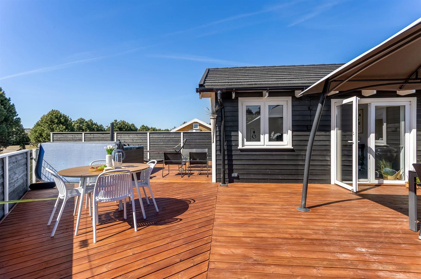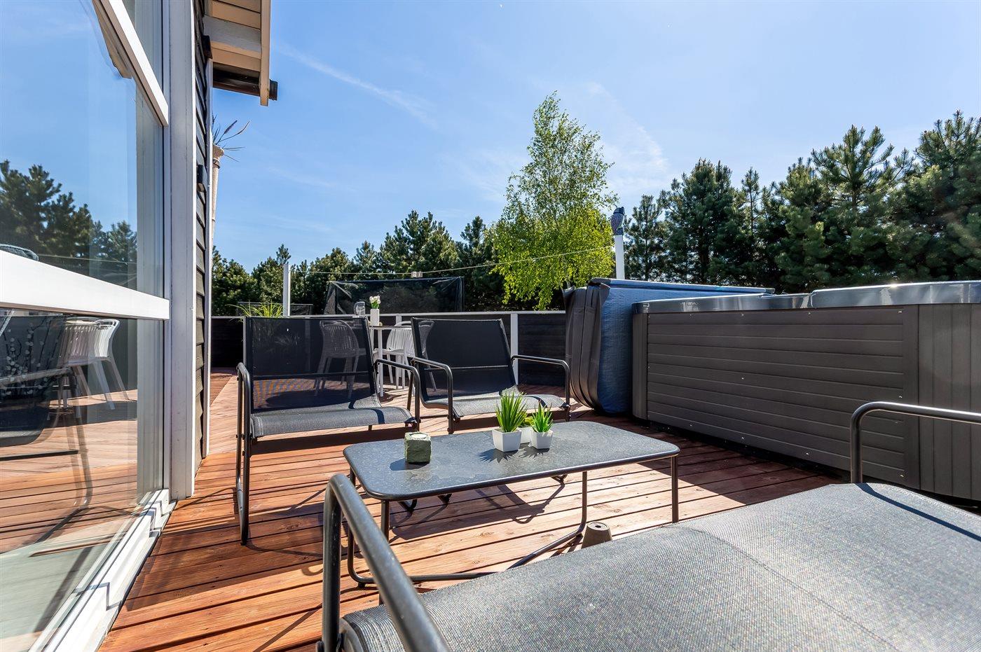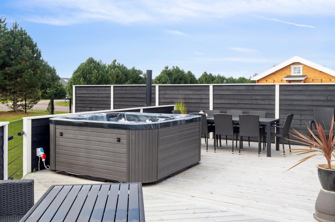 Der findes et til dels overdækket terrasseareal med havemøbler og grill, hvor man kan nyde skønne timer i det fri og dejlige grillaftner med familie og venner. Der findes også en 6-pers spa med standvand, hvor man kan nyde det varme vand, sænke skuldrene og bare slappe af.