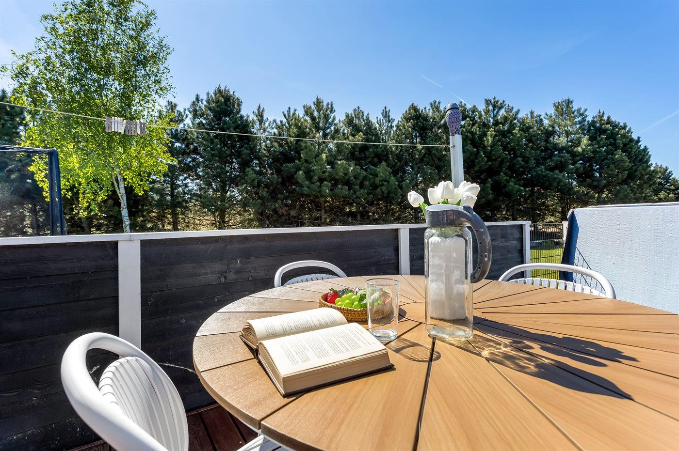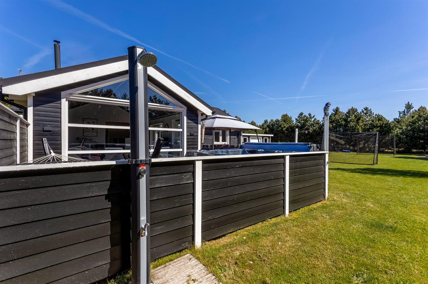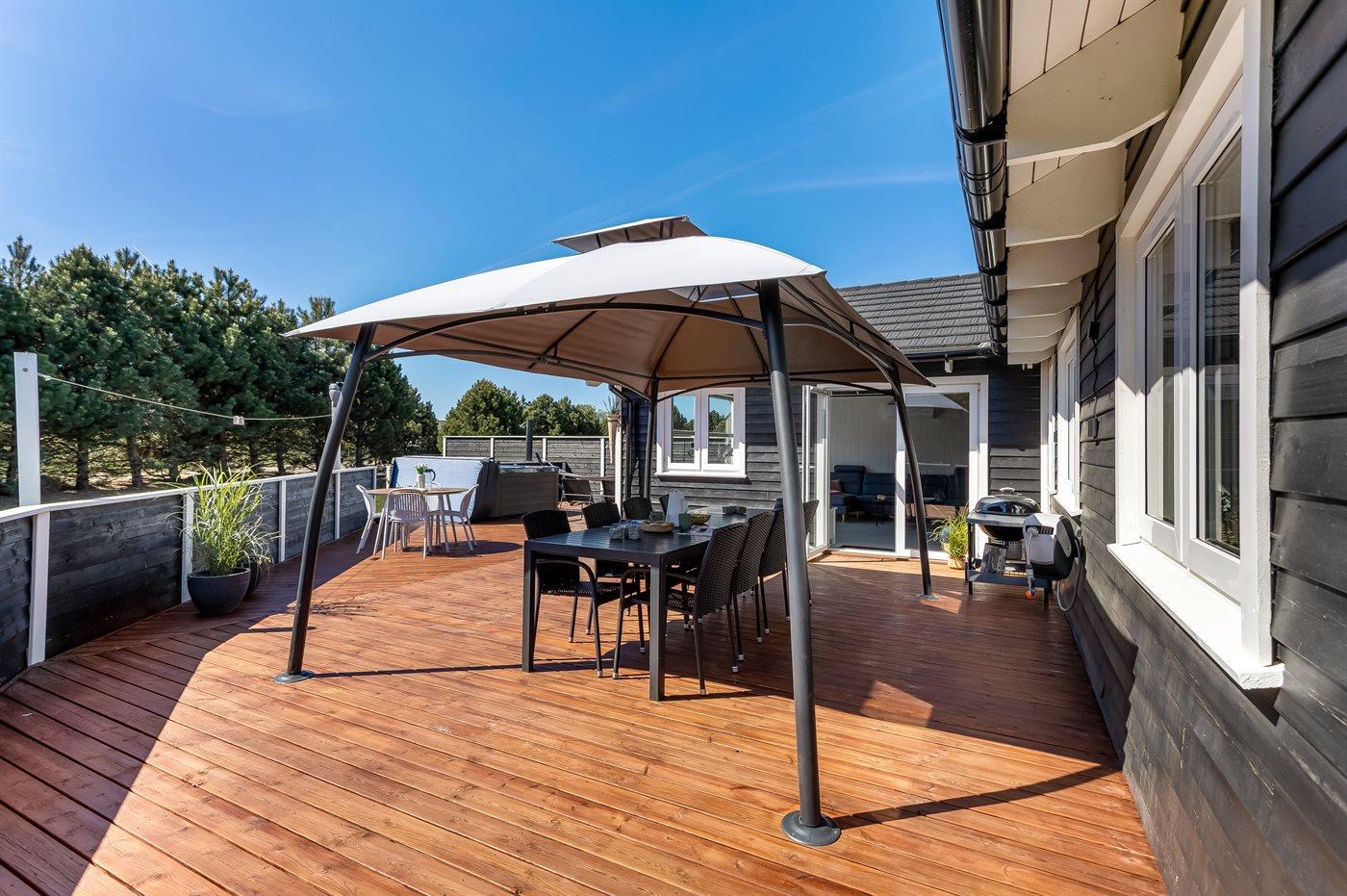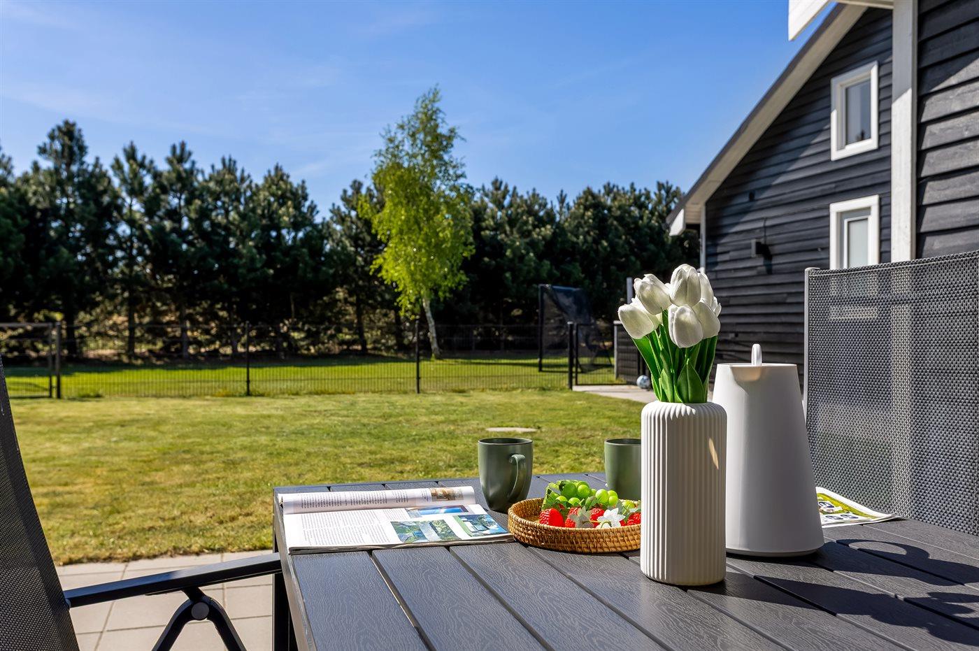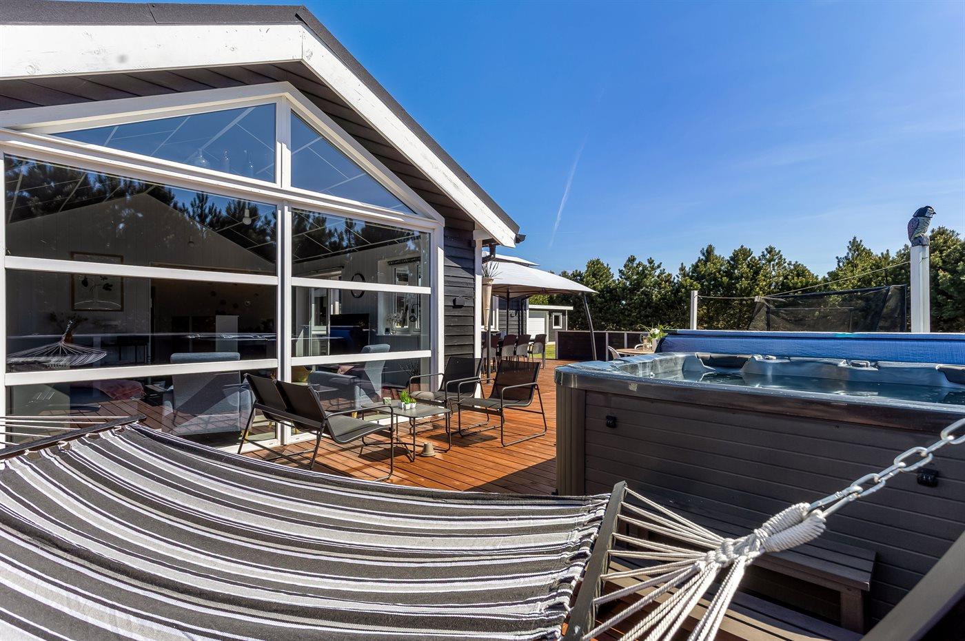 Der findes et til dels overdækket terrasseareal med havemøbler og grill, hvor man kan nyde skønne timer i det fri og dejlige grillaftner med familie og venner. Der findes også en 6-pers spa med standvand, hvor man kan nyde det varme vand, sænke skuldrene og bare slappe af.