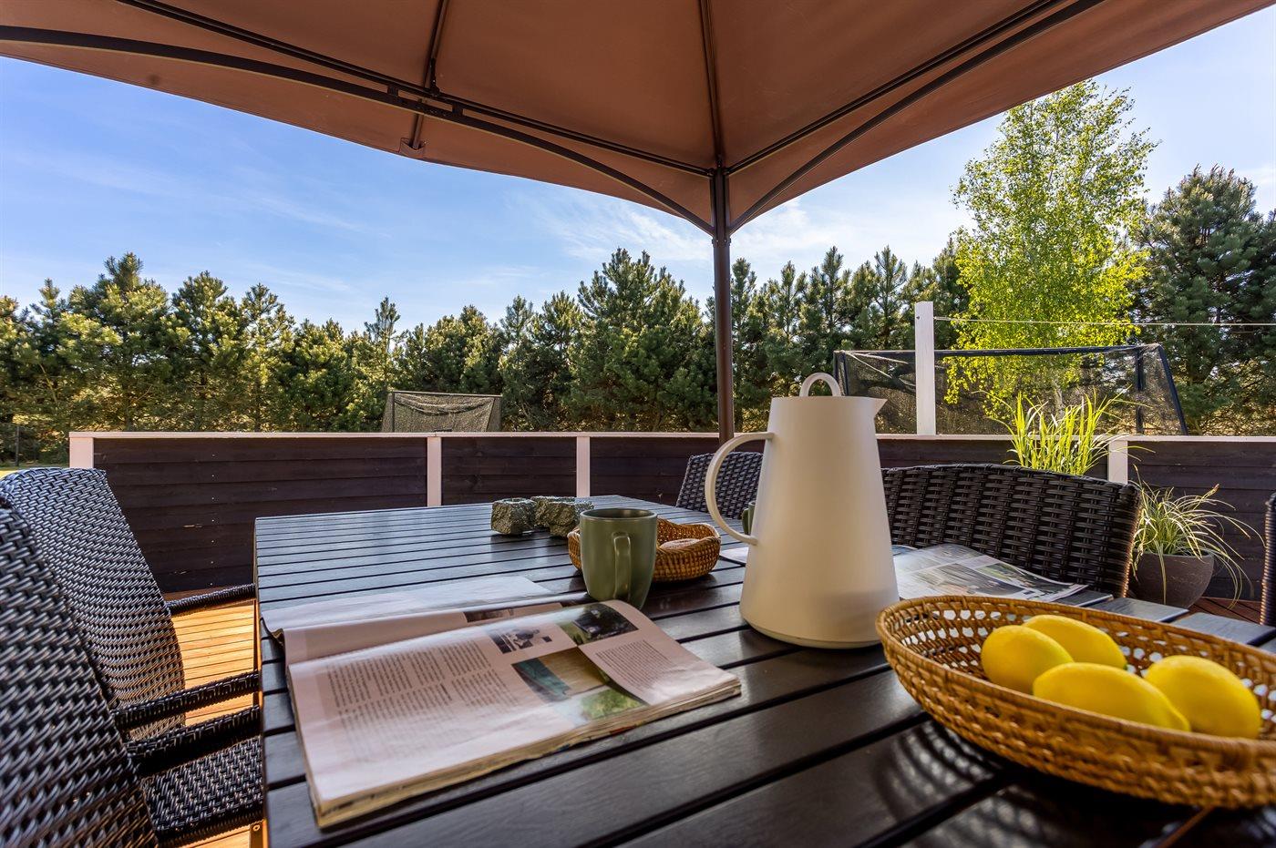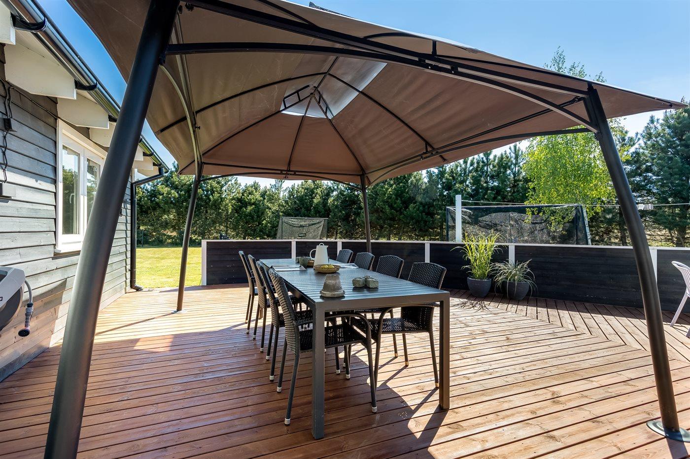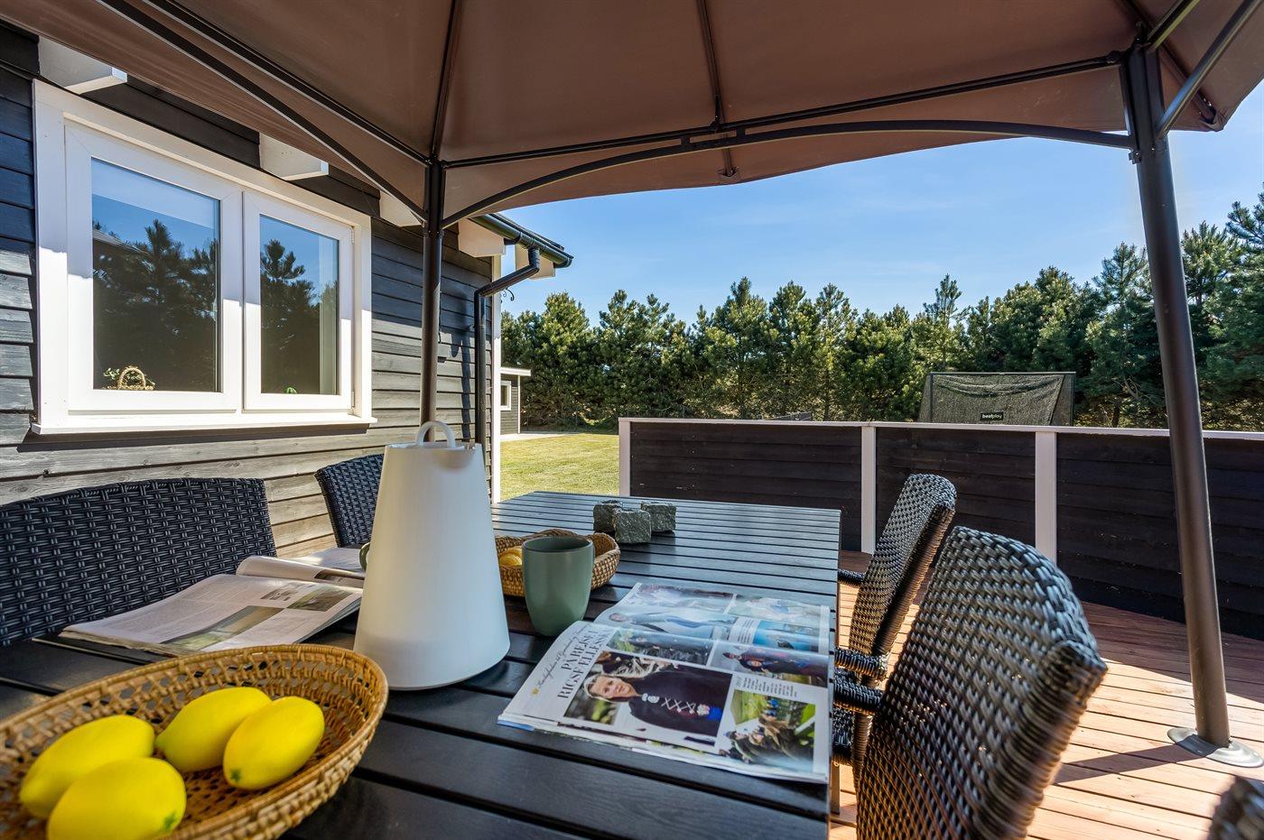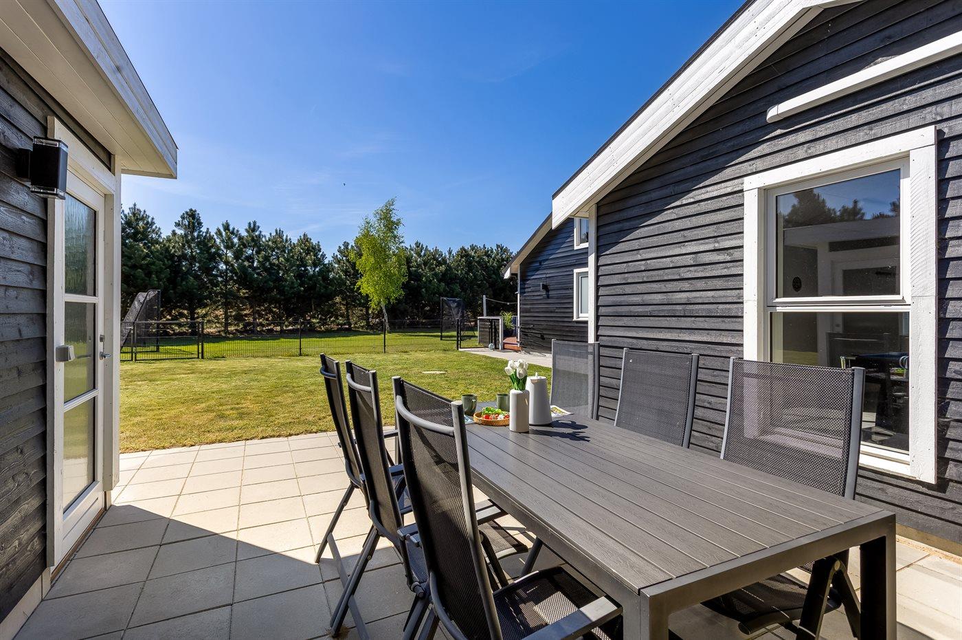 Der findes et til dels overdækket terrasseareal med havemøbler og grill, hvor man kan nyde skønne timer i det fri og dejlige grillaftner med familie og venner. Der findes også en 6-pers spa med standvand, hvor man kan nyde det varme vand, sænke skuldrene og bare slappe af.