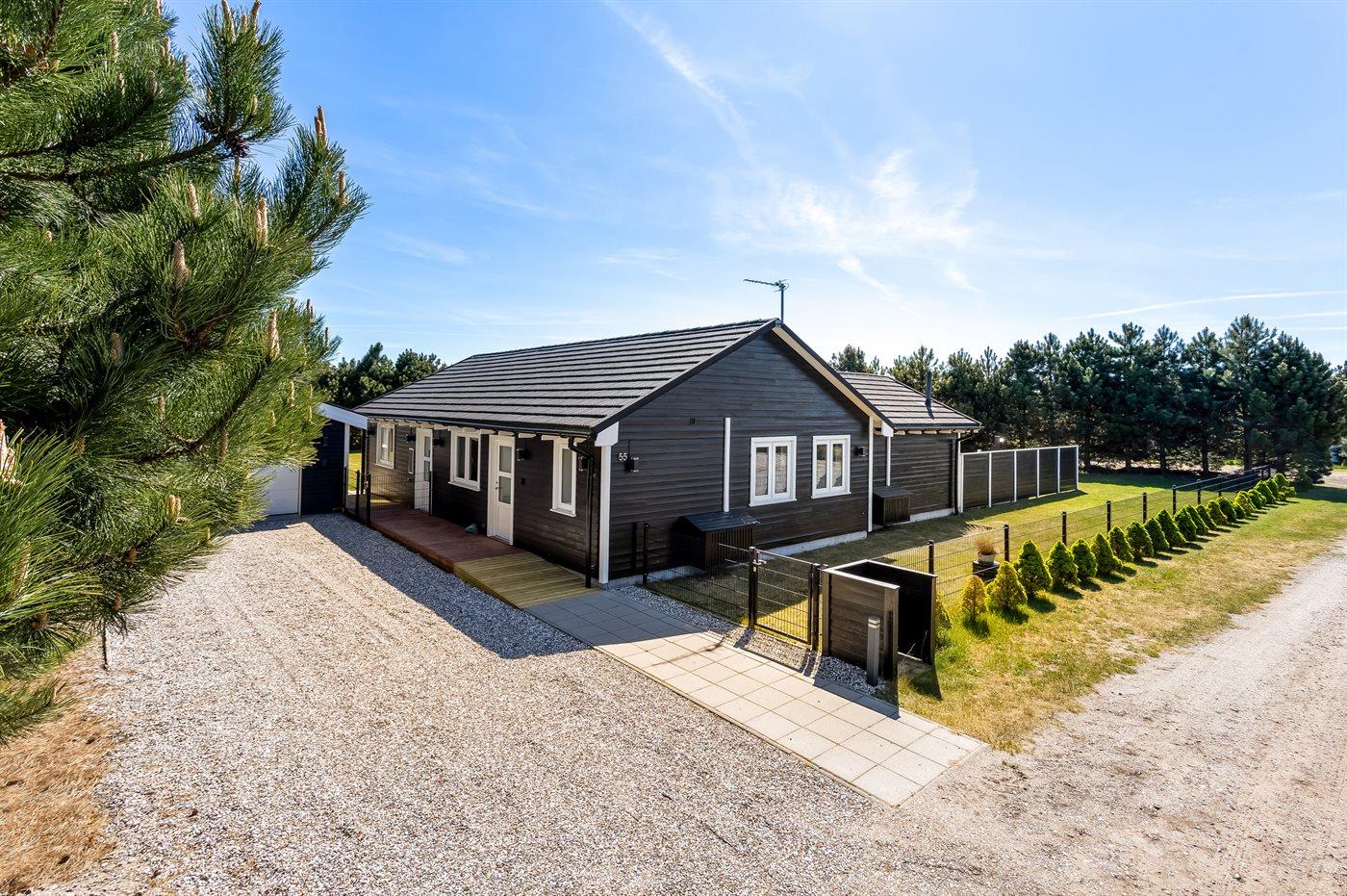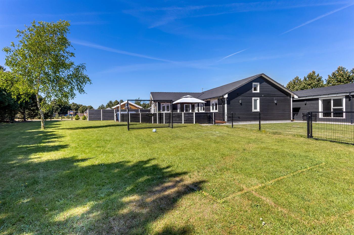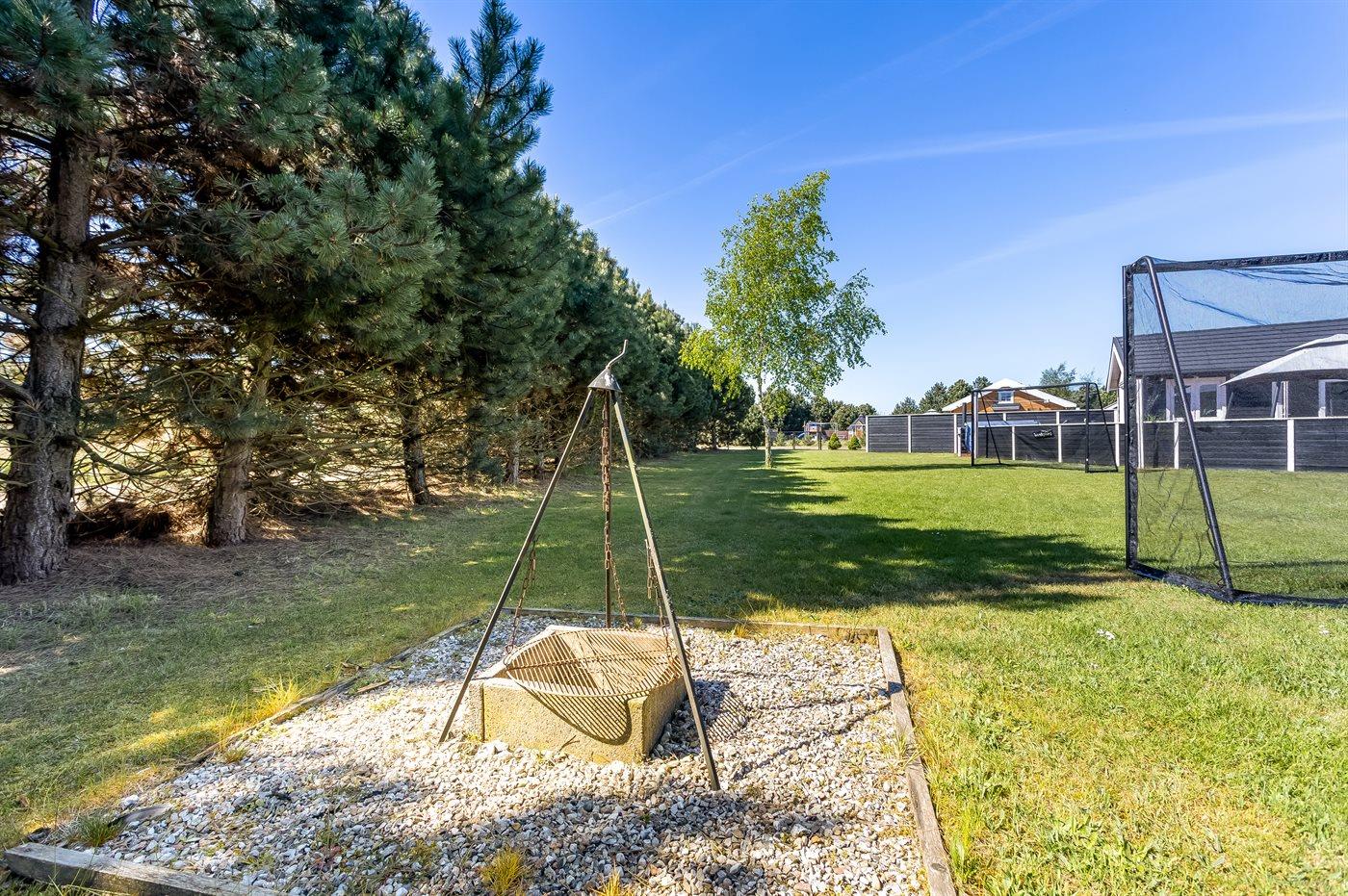 Ferieboligen er beliggende på en 1455 m² stor naturgrund. Grunden er indhegnet. Der er 1300 m til havet. Nærmeste forretning er beliggende i en afstand af 1000 m. Der er en golfbane i en afstand af 1000 m. Til ferieboligen hører lukket terrasse. Trampolin. Fodboldmål. Bålsted. Grill til rådighed. Der er installeret stik til opladning af elbil. Type 2 stik. Med 11 kW ladeeffekt. Parkering ved ferieboligen.