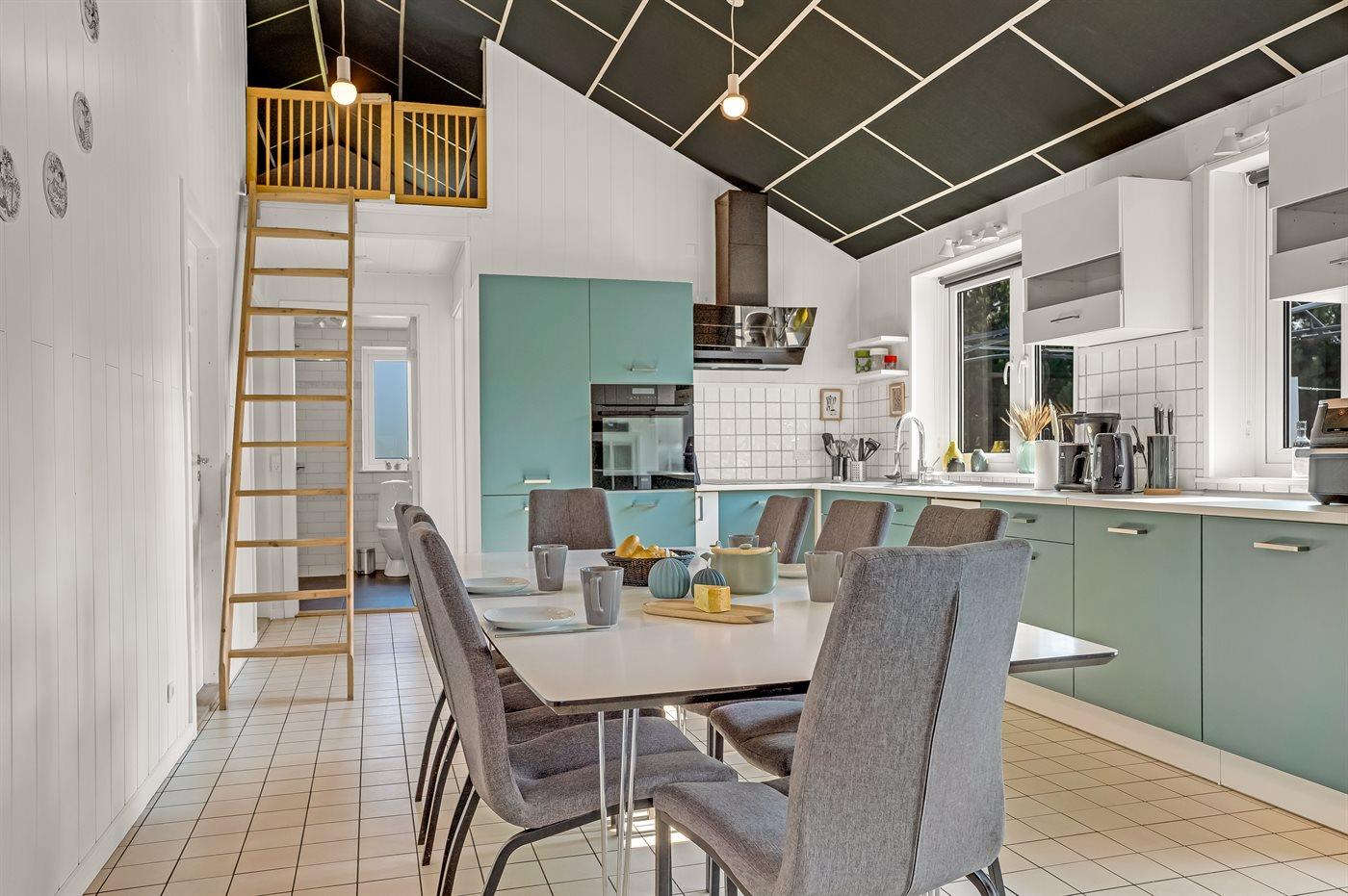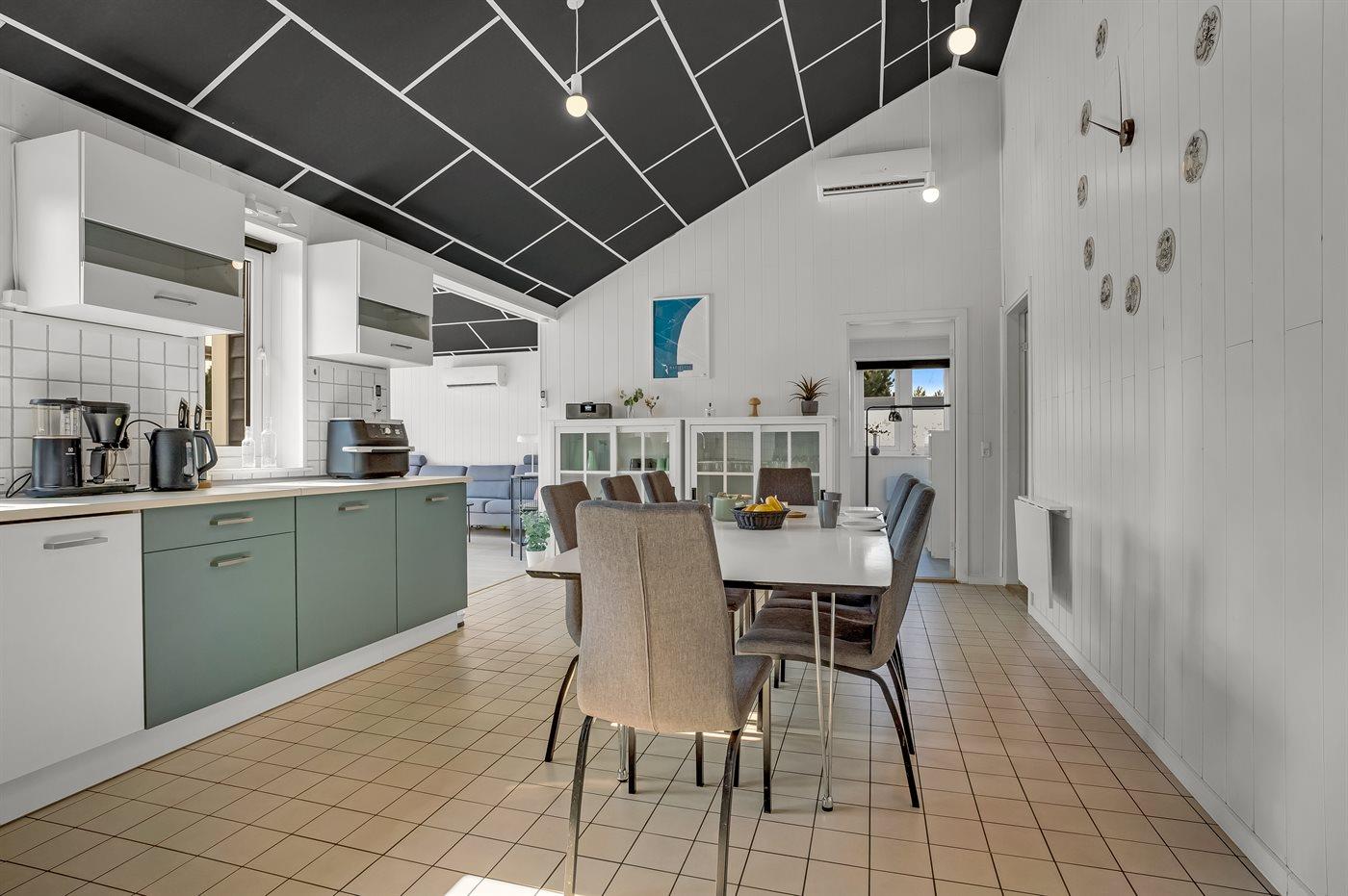 Køkkenet er udstyret med 1 køleskab. Der er 4 induktionskogeplader, varmluftovn, mikrobølgeovn, Airfryer samt opvaskemaskine Der er gulvvarme i køkkenet.