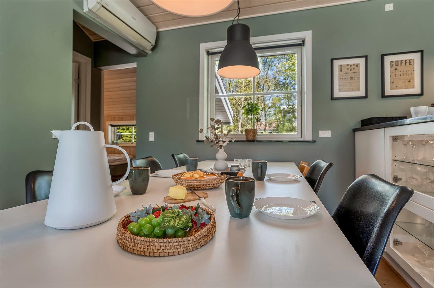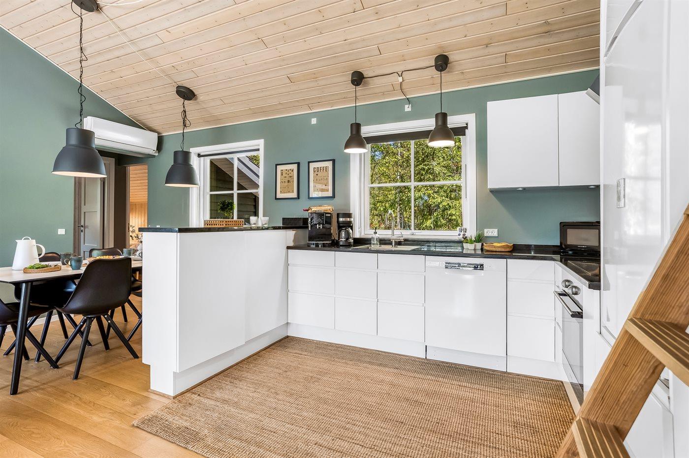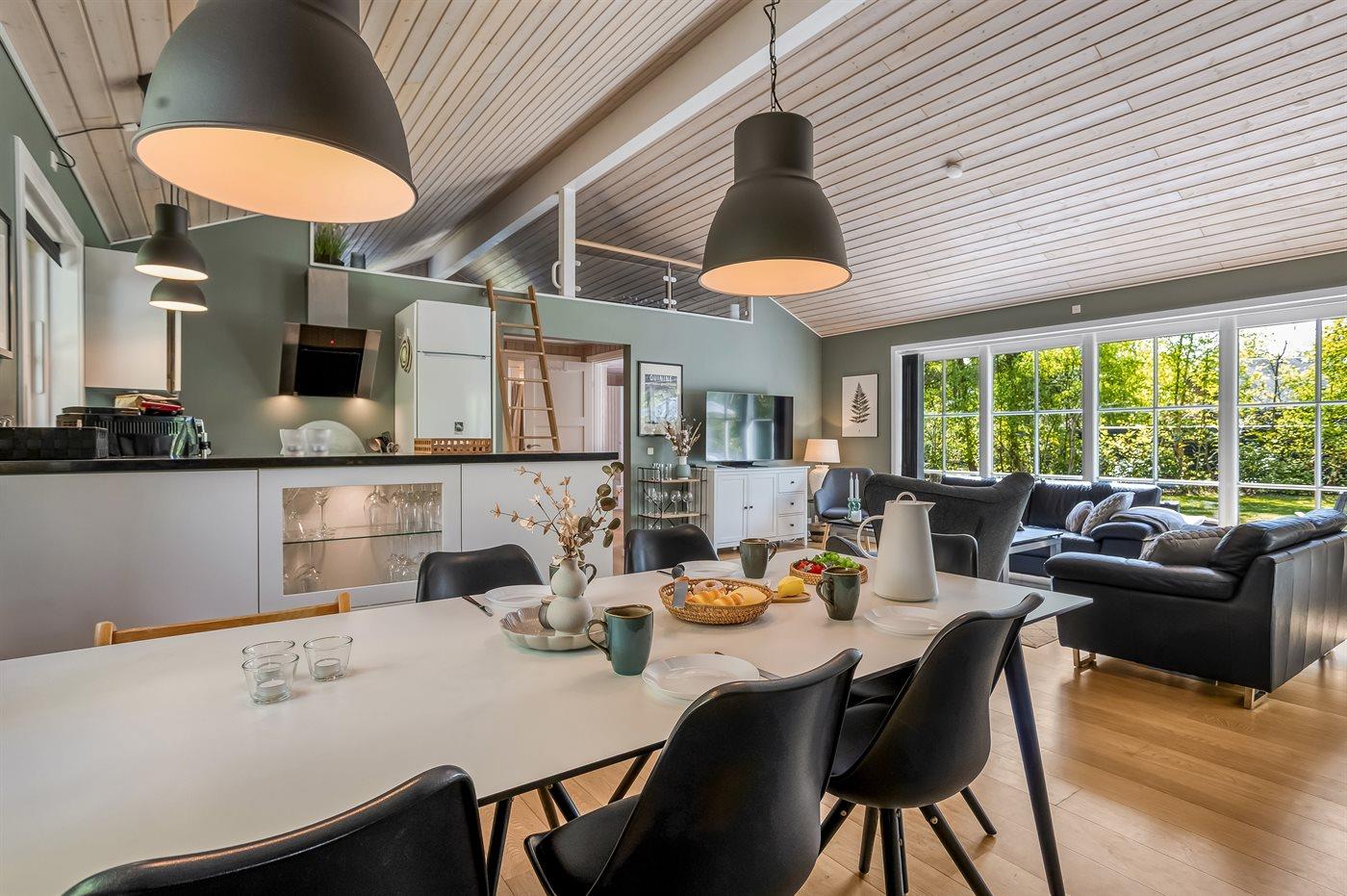 Køkkenet er udstyret med 1 køleskab. Der er 4 keramiske kogeplader, varmluftovn, mikrobølgeovn, Airfryer samt opvaskemaskine.