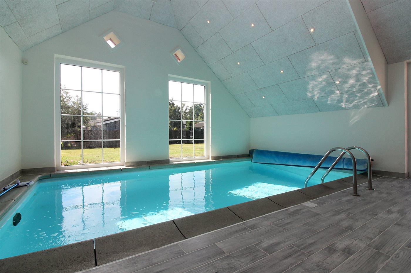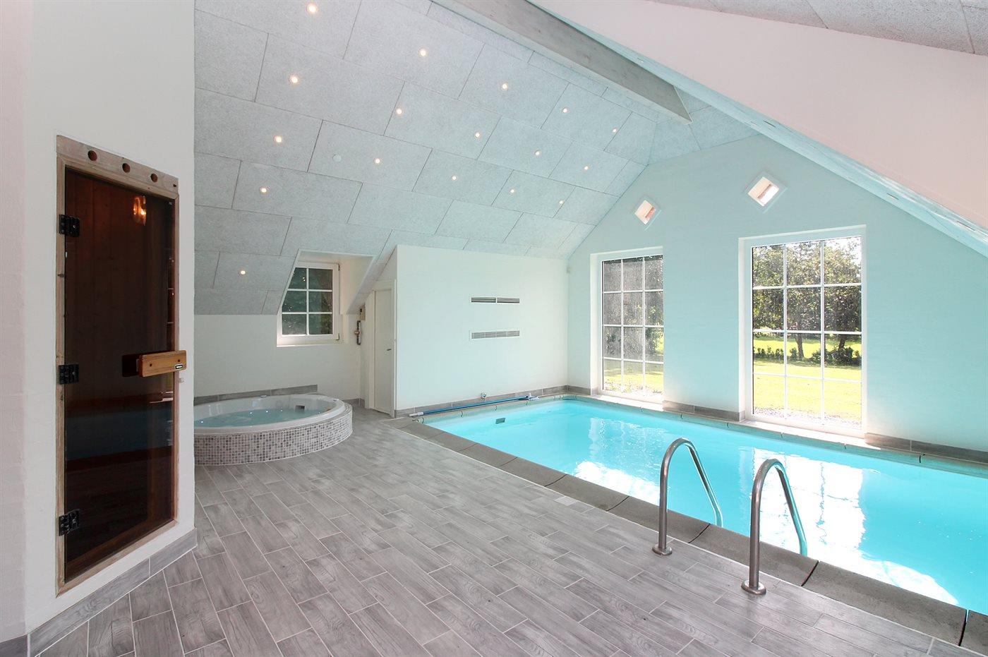Flot renoveret sommerhus med indendørs pool, spa og stor lukket have nær børnevenlig strand.