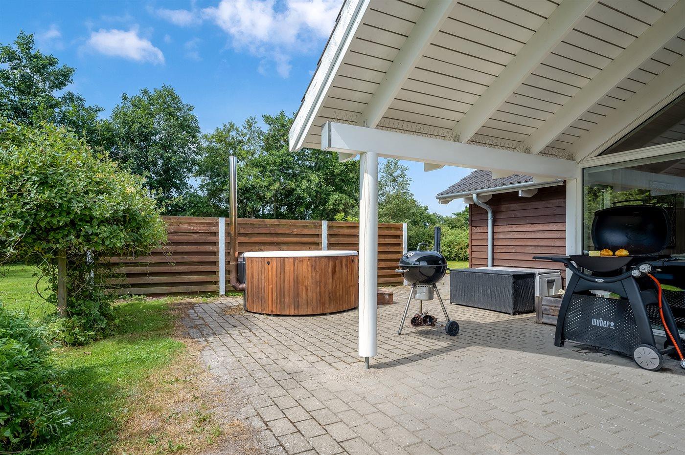 Den gode terrasse – både overdækket og åben – har masser af plads til hele familien i de skønne sommerdage og -aftener. På sommerhusets grund er der plads til hygge og spil.