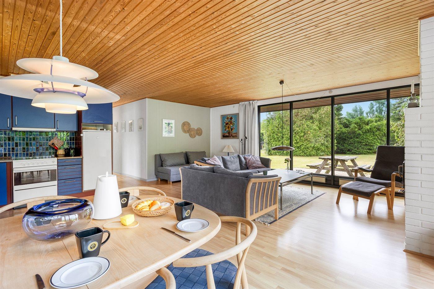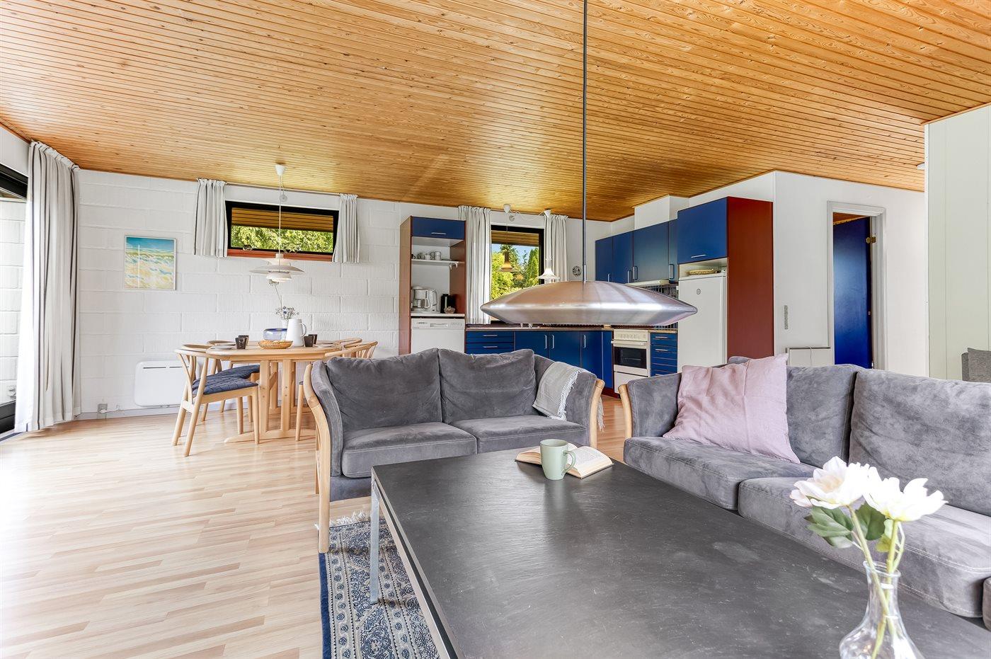Der findes kombineret køkken og opholdsstue, hvor der er god plads til fælles madlavning og hyggeligt samvær. Sovepladserne fordeler sig på 2 soveværelser, hvoraf det ene er indrettet med dobbeltseng og det andet med køjeseng. Desuden findes der en dobbelt sovesofa i opholdsstuen.