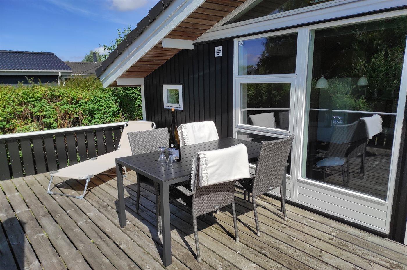 Ferieboligen er beliggende på en 935 m² stor naturgrund. Der er 700 m til havet. Nærmeste forretning er beliggende i en afstand af 200 m. Til ferieboligen hører 70 m² terrasseareal. Desuden er der 23 m² overdækket terrasse. Der er redskabsrum. Sandkasse. Grill til rådighed. Der er installeret stik til opladning af elbil - type Webasto Pure. Type 2 stik. Med 11 kW ladeeffekt. Parkering ved ferieboligen.